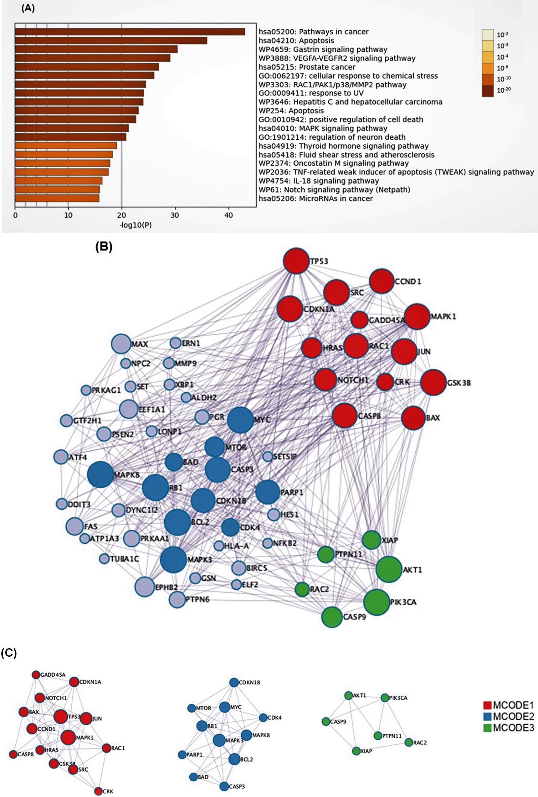 (A) shows a bar graph of enriched terms across input gene lists, colored by p-values, as shown on the sidebar, while (B) and (C) are protein-protein interaction (PPI) enrichment analysis of the molecular complex detection (MCODE) algorithm has been identified for individual gene lists have been gathered and are shown in (B) the three best-scoring terms by p-value are the functional description of the corresponding components genes are shown in the figure. In (C) MCODE1 represents Chromosomal and microsatellite instability in colorectal cancer and cancer pathways); MCODE2 represents PI3K-AKT-mTOR signaling pathway and therapeutic opportunities and cancer pathways; and MCODE3 represents apoptosis and cancer pathways). The size of the node is related to the protein p-value.