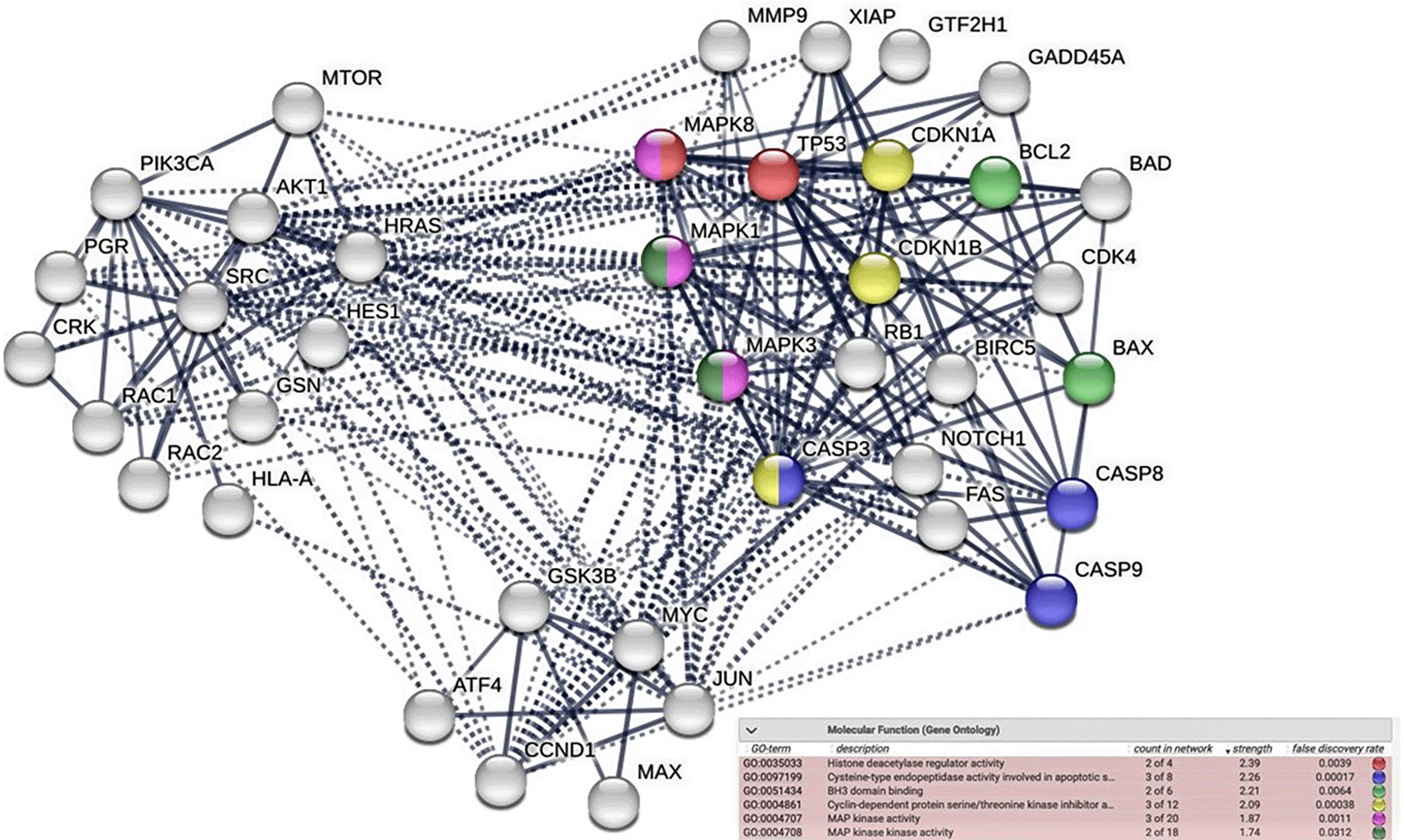 Utilizing the highest ten enrichment analysis pathways that were carried out using KEGG (log P is between -42.7857 and -30.1946) 40 common genes i.e. represented in more than two pathways were selected for protein-protein interaction (PPI) analysis. The 40 proteins were uploaded into an online database that can be used for PPI known as the STRING database ( https://string-db.org). Mapping of the 40 genes showed 40 nodes (interactions) along with 225 edges and 63 expected edges with PPI enrichment p-value:< 1.0e-16 analysed at high confidence (0.700) minimum required interaction score. The selected proteins formed three clusters that contained 21,12 and 7 proteins (Figure 6). The top molecular functional processes with the highest strength were used to determine the functions associated with the annotated proteins. The top functional processes were identified to be histone deacetylase regulator activity (GO:0035033; p= 0.0039, strength: 2.39), cysteine-type endopeptidase activity involved in apoptotic signalling pathway (GO:0097199; p=0.00017; strength: 2.26), BH3 domain binding (GO:0051434; p=0.0064; strength: 2.21), cyclin-dependent protein serine/threonine kinase inhibitor activity (GO:0004861; p=0.00038; strength: 2.09) and MAP kinase activity(GO:0004707; p=0.0011; strength: 1.87). Interestingly, all the molecular functions that regulated initiator cell death were found in one cluster, which includes the mammalian family of mitogen-activated protein kinases (MAPK 1,3 and 8), the caspase family proteins CASP 3,8 and 9, and some cell cycle regulators such as CDK4, CDKN1B and CDKN1A (Figure 6). Based on the STRING analysis, the mammalian family of MAPK appear to be important targets for T3s to exert their anticancer activity, which is in sync with their pro-apoptotic and cell cycle dysregulation activities. However, MAPKs activity is subjective to the type of the malignancies, and their microenvironment, as these have been found to have dual effects as oncogenes and tumour suppressors in some cancers and related microenvironment.68,69