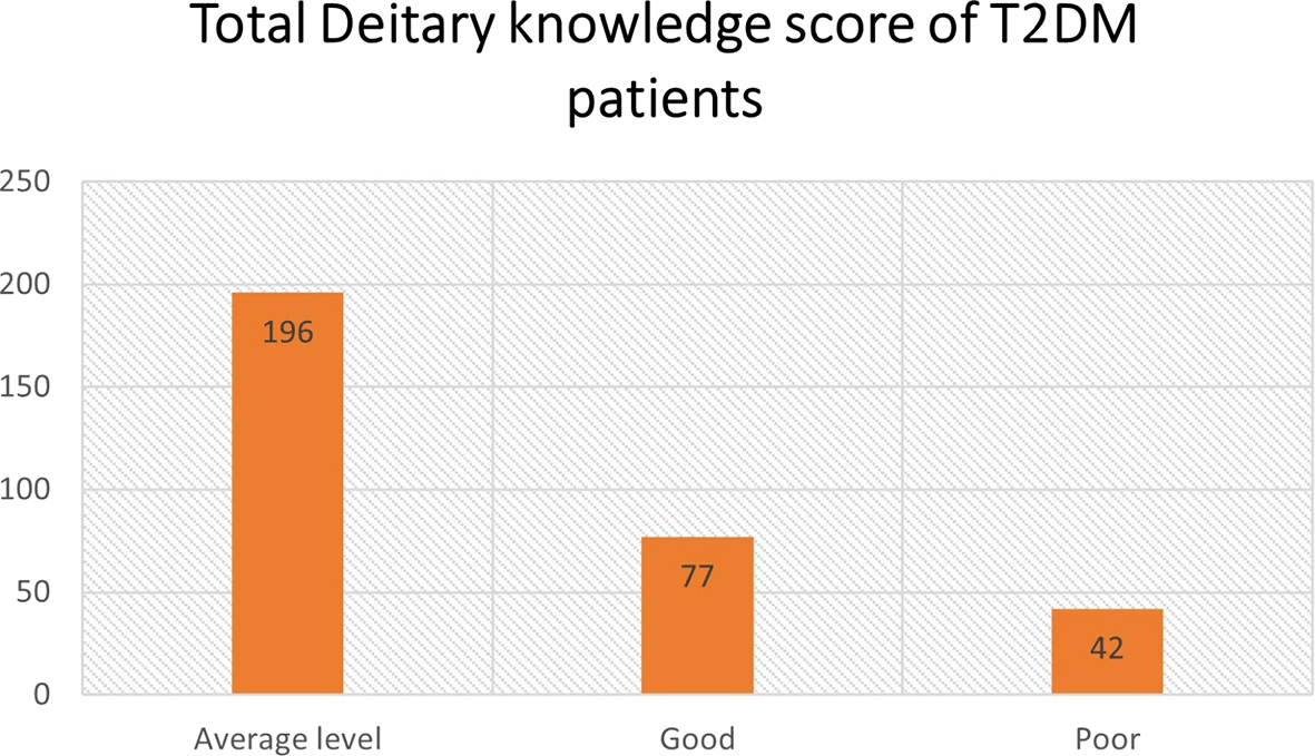 Different studies around the world showed various levels of dietary knowledge among type 2 diabetic patients. In agreement with our study, another study conducted on T2DM patients in Iran showed average levels of dietary knowledge.21 In contrast, a study reported inadequate dietary knowledge among T2DM females of Amman, Jordan.20 A study conducted in Ethiopia found a poor level of dietary knowledge and practices.22