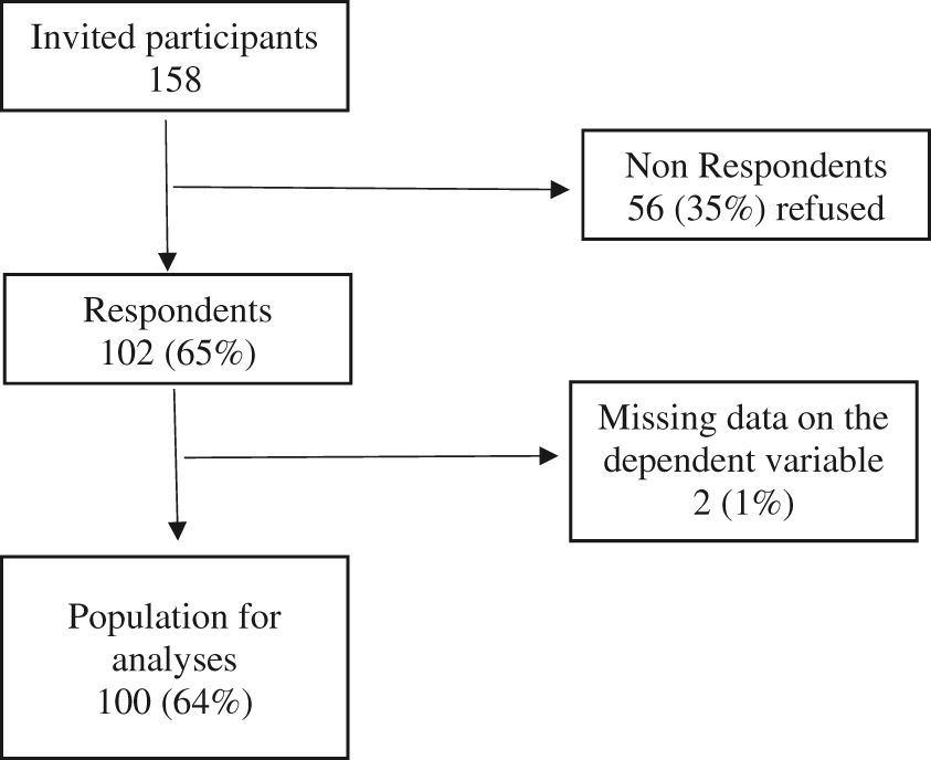 This study invited 158 participants; 56 participants refused and did not respond the questionnaire. Two had missing data on the dependent variable and could not be contacted for confirmation of research data. A total of 100 participants were studied (Figure 2).