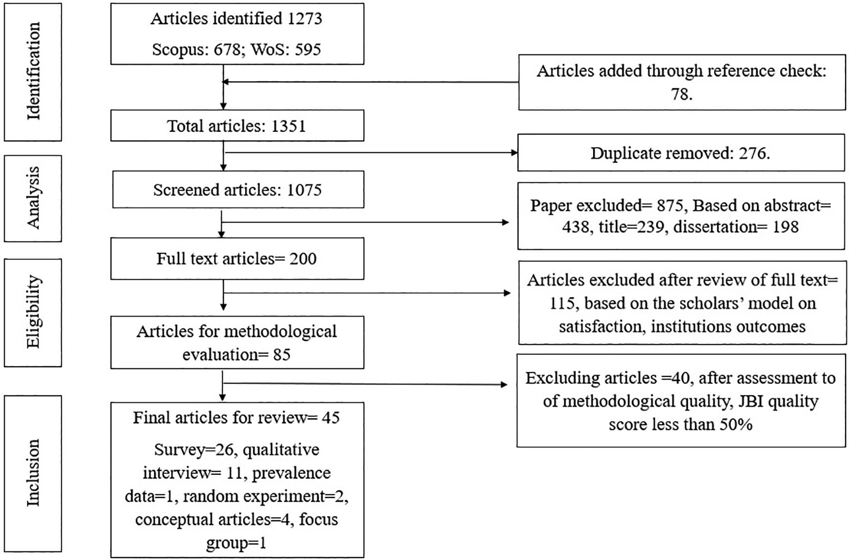 Studies undertaken in an “academic setting” were considered for inclusion, which had been determined by the criteria that include studies on the JD-R model, motivation studies, differentiated job demands, and well-being among doctoral students. Also, quantitative, qualitative, conceptual, and mixed methods studies published in the English language from 2000 onwards were included because of the significant transformation in structured doctoral education across different countries starting from the 20th century onward (Kot & Hendel, 2012). The reviewers excluded the studies beyond the scope of the above inclusion search criteria. The articles focusing on institutional or individual outcomes were excluded from the study, for example, program satisfaction, Ph.D. dropout rate, and students’ performance. Based on the quality scores allotted by the reviewers as per JBI, the articles not meeting the quality requirement were excluded. The articles were chosen based on whether the selected final articles had been empirically tested, and theoretically supported. Finally, 45 studies were included in the review (see Figure 1). We followed the PRISMA integrative review checklist to identify, select, appraise, and synthesise studies.