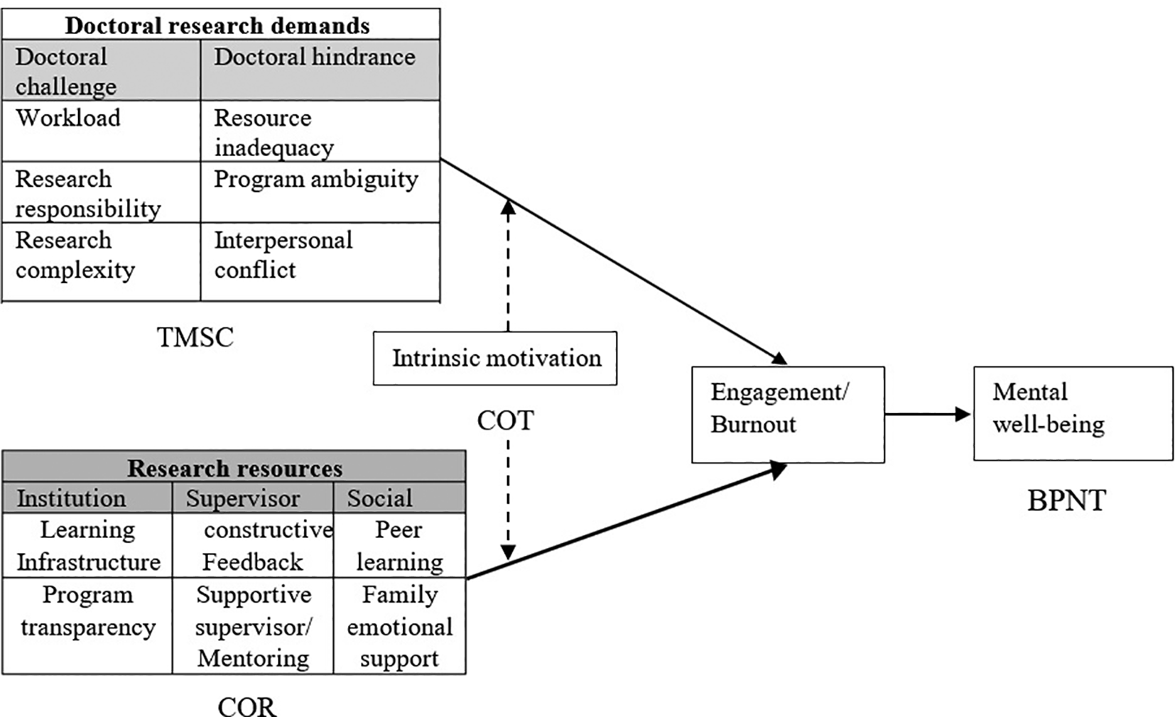 Using insights from the Conservation of Resources (COR) Theory, we explain the doctoral program is bound with resources along with the demands. Indeed, from the COR theory, doctoral students are always required and willing to develop the resources to manage stressful demands. Absence of these resources creates a stressful situation for the student and results in burnout. Adequate contextual and personal resources help students to mitigate work demands and maintain individual well-being. Under the COR theory, institution, supervisor, and social support are viewed as contextual resources, and intrinsic motivation is a personal resource that improves the mental health of doctoral students (Sufyan & Ali Ghouri, 2020). Drawing on COR theory, resources gained from peer support, supervisor mentoring, learning support from institutions, and emotional support from the family will enhance an individual’s intrinsic motivation by protecting against resource loss (Boone et al., 2020). Sufyan and Ali Ghouri (2020) adopted the COR theory and JD-R model to study doctoral students’ stress. The study results conveyed that high demand and lack of resources will impact their academic journey. Thus, their findings suggest that the scope for inclusion of COR and JD-R has a significant role in determining the mental health of students.
