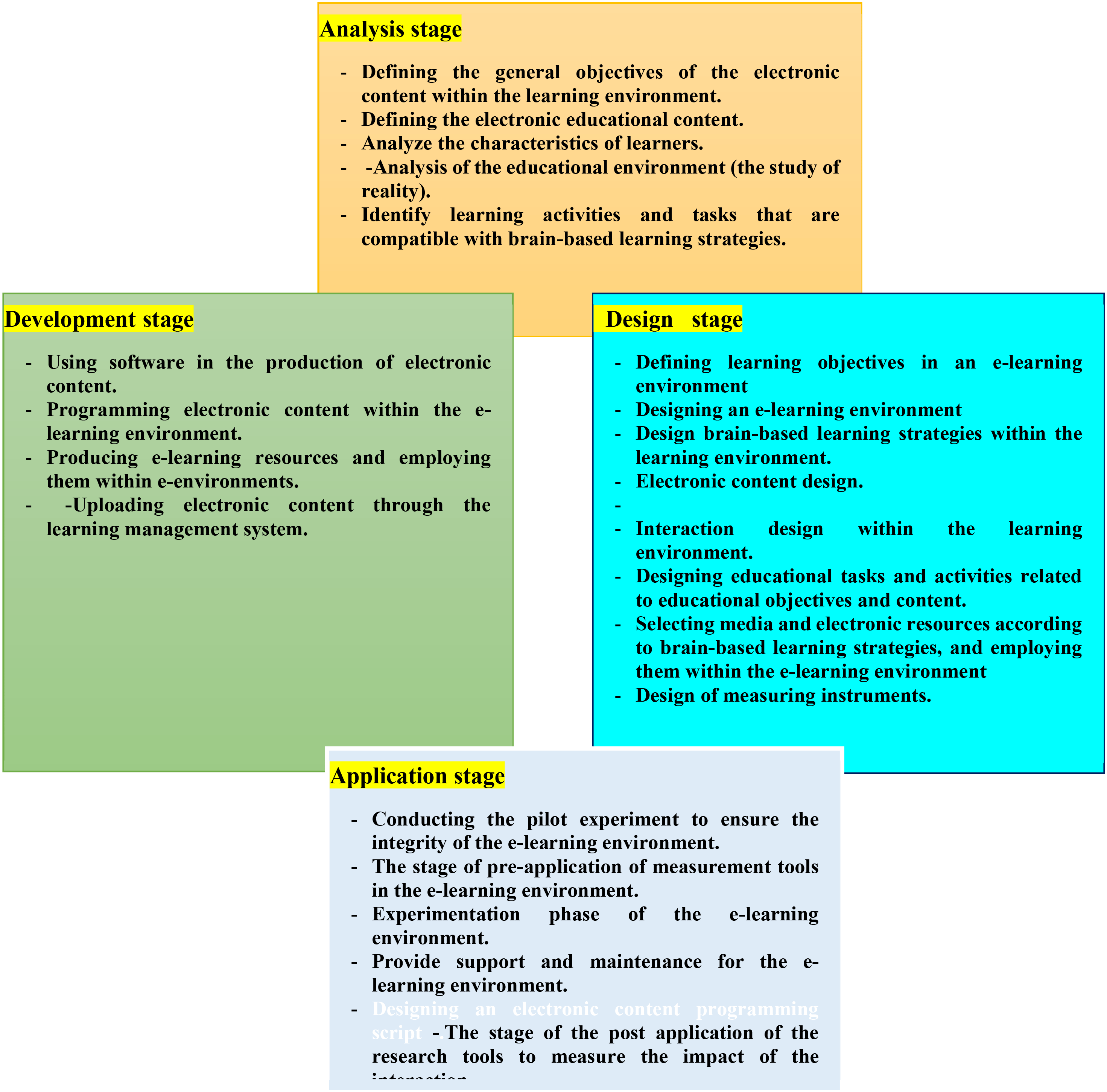 • Good design of static and animated infographics, adaptive e-learning environment in light of design and production standards, choosing a model for designing e-learning environment compatible with brain-based learning strategies,