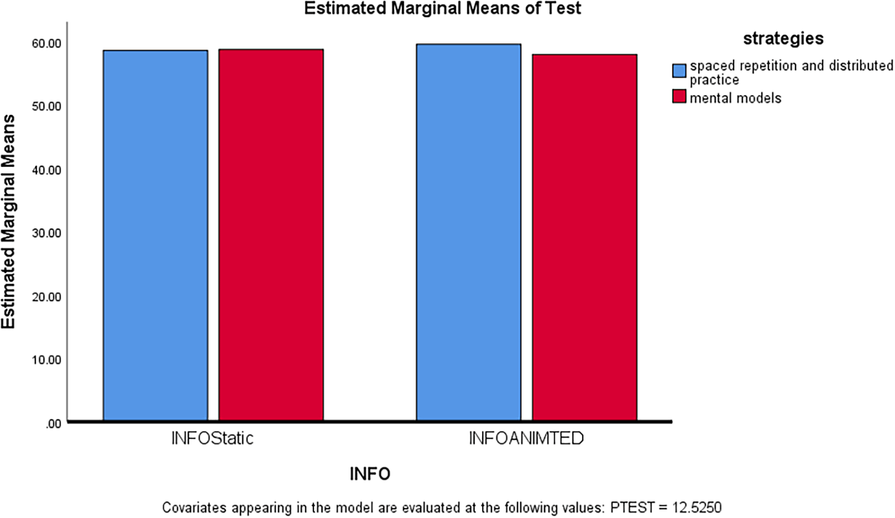 There is a significant interaction between brain-based learning strategies (spaced repetition and distributed practice - mental models) and patterns of infographics (static/animated) in e-learning setting in the post-measurement of Information Concepts Test after adjusting the pre-measurement effect.