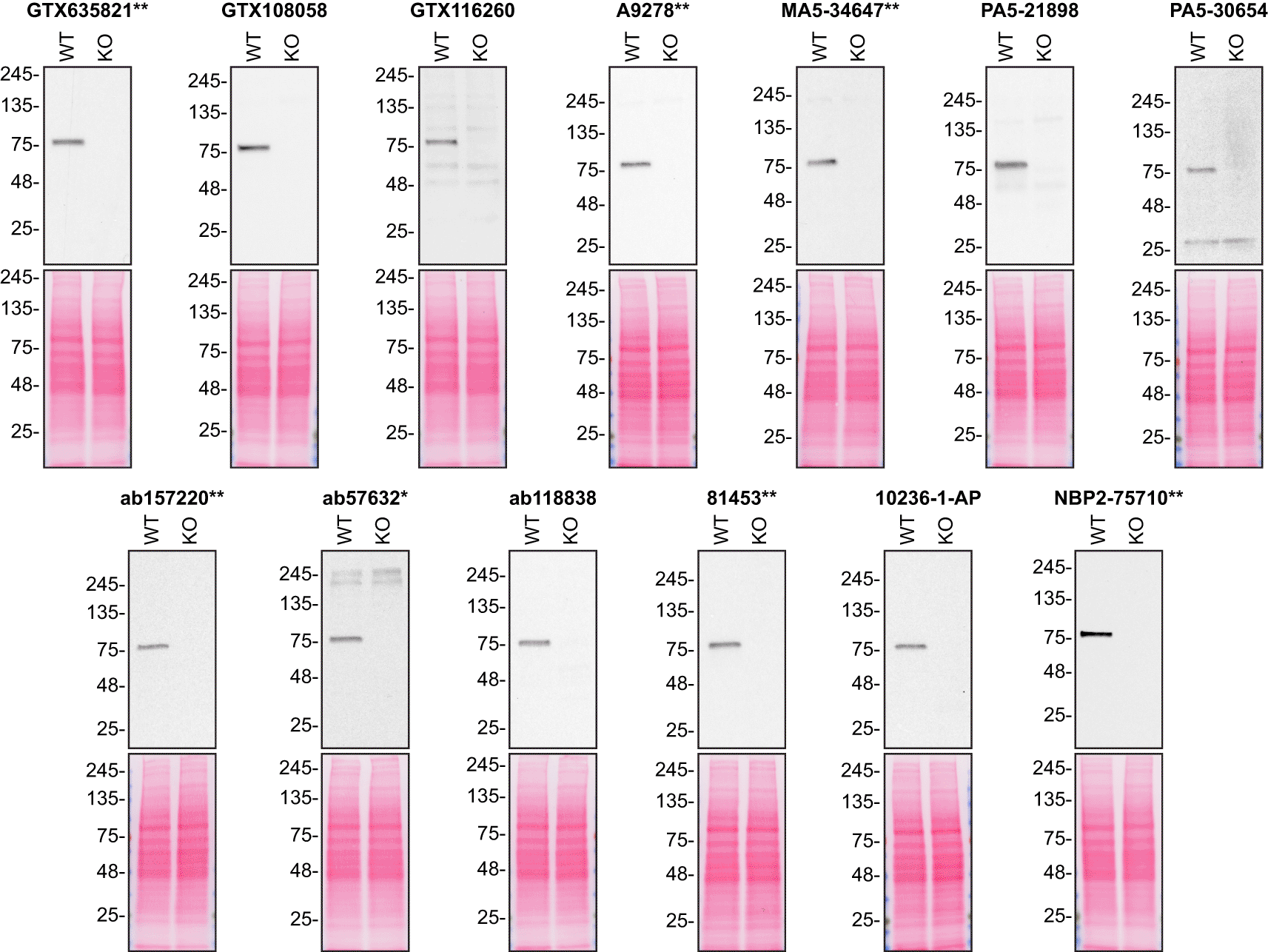 Lysates of HAP1 (WT and VPS35 KO) were prepared and 20 μg of protein were processed for Western Blot with the indicated hVPS35 antibodies. The Ponceau stained transfers of each blot are presented to show equal loading of WT and KO lysates and protein transfer efficiency from the polyacrylamide gels to the nitrocellulose membrane. Antibody dilutions were chosen according to the recommendations of the antibody supplier. An exception was given for antibody 81453**, which was titrated to 1/500, as the signal was too weak when following the supplier’s recommendations. Antibody dilution used: GTX635821** at 1/1000, GTX108058 at 1/1000, GTX116260 at 1/1000, A9278** at 1/1000, MA5-34647** at 1/1000, PA5-21898 at 1/1000, PA5-30654 at 1/1000, ab157220** at 1/1000, ab57632* at 1/270, ab118838 at 1/900, 81453** at 1/500, 10236-1-AP at 1/500, NBP2-75710** at 1/1000. Predicted band size: 91 kDa. *=monoclonal antibody, **=recombinant antibody.