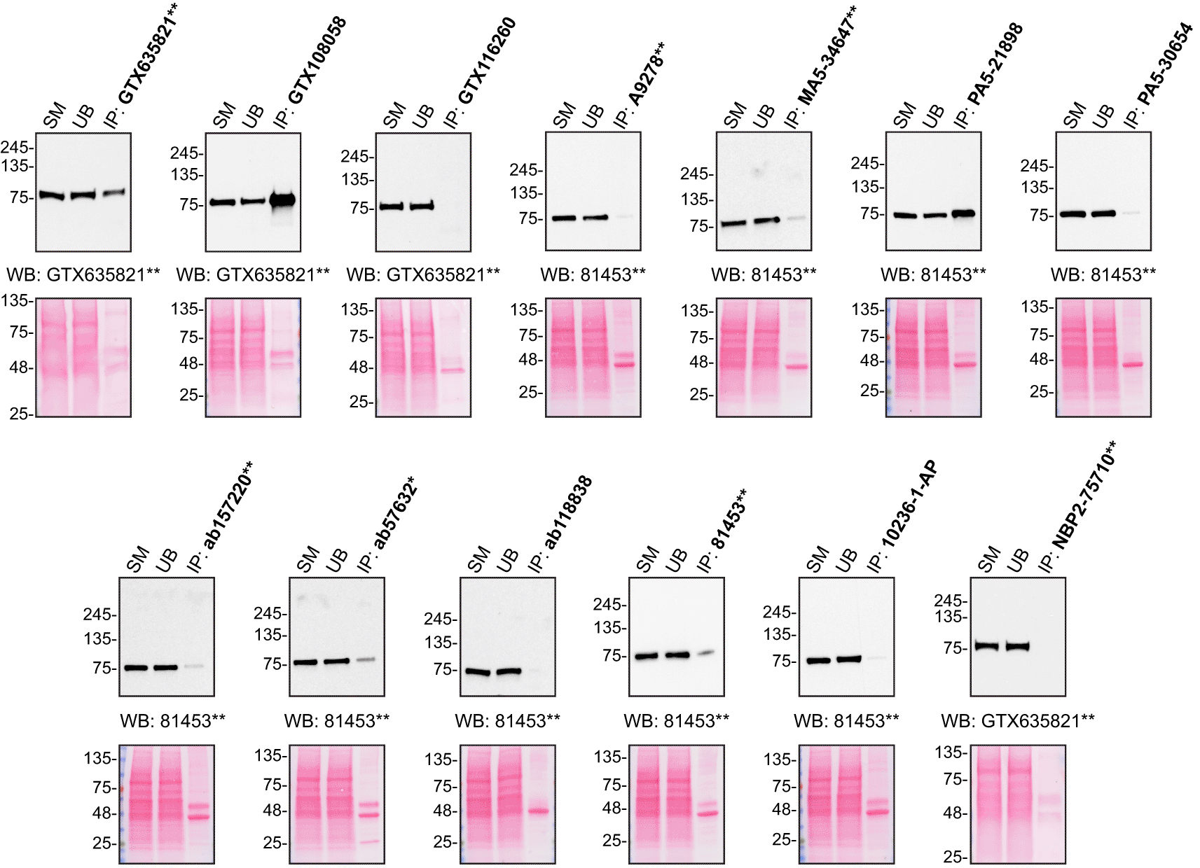 HAP1 lysates were prepared, and IP was performed using 2.0 μg of the indicated hVPS35 antibodies pre-coupled to Dynabeads protein A or protein G. Samples were washed and processed for Western Blot with the indicated hVPS35 antibody. For Western Blot, GTX635821** and 81453** were used at 1/1000 and 1/500, respectively. The Ponceau stained transfers of each blot are shown. SM=2% starting material; UB=2% unbound fraction; IP=immunoprecipitate. *=monoclonal antibody, **=recombinant antibody.