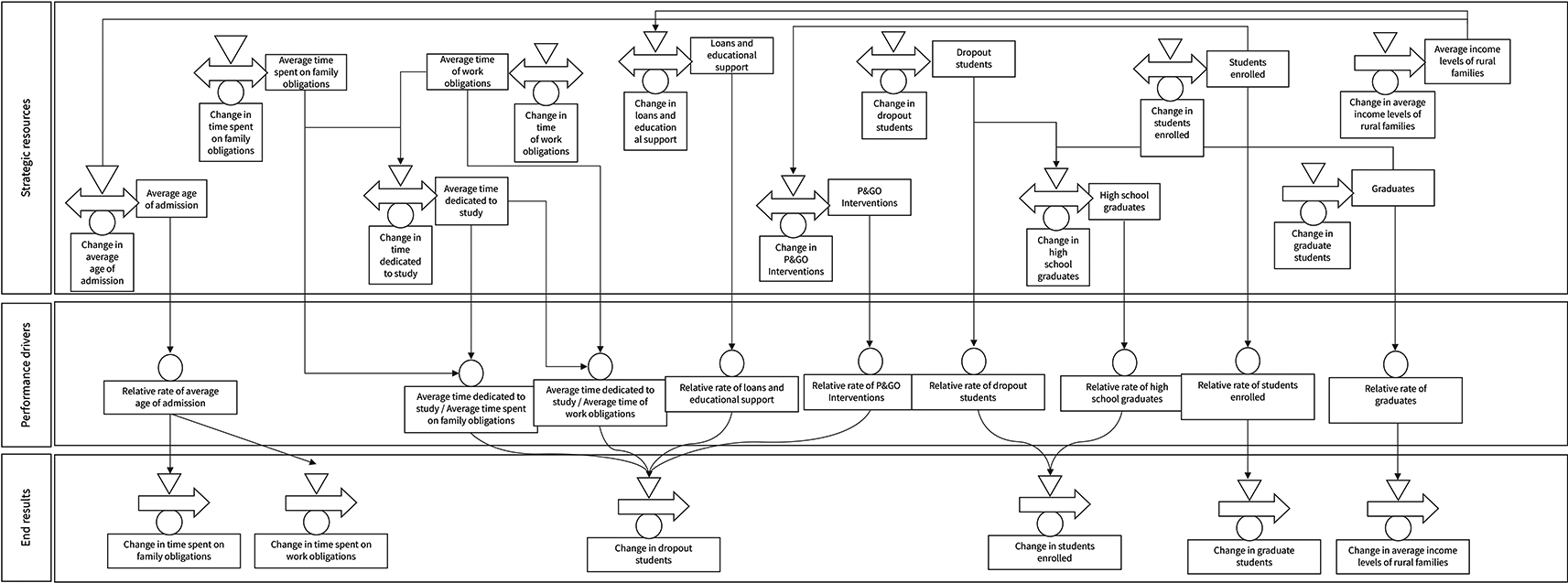 To develop the DPM Chart, we have identified 11 strategic resources, nine performance drivers, and six end results (five outcomes and one output) as shown in Figure 1. The first strategic resource pertains to the average admission age to higher education, which means that the higher the age of admission, the more time students will spend on family obligations (second resource) and work (third resource), competing with the time devoted to study (fourth resource).2,30