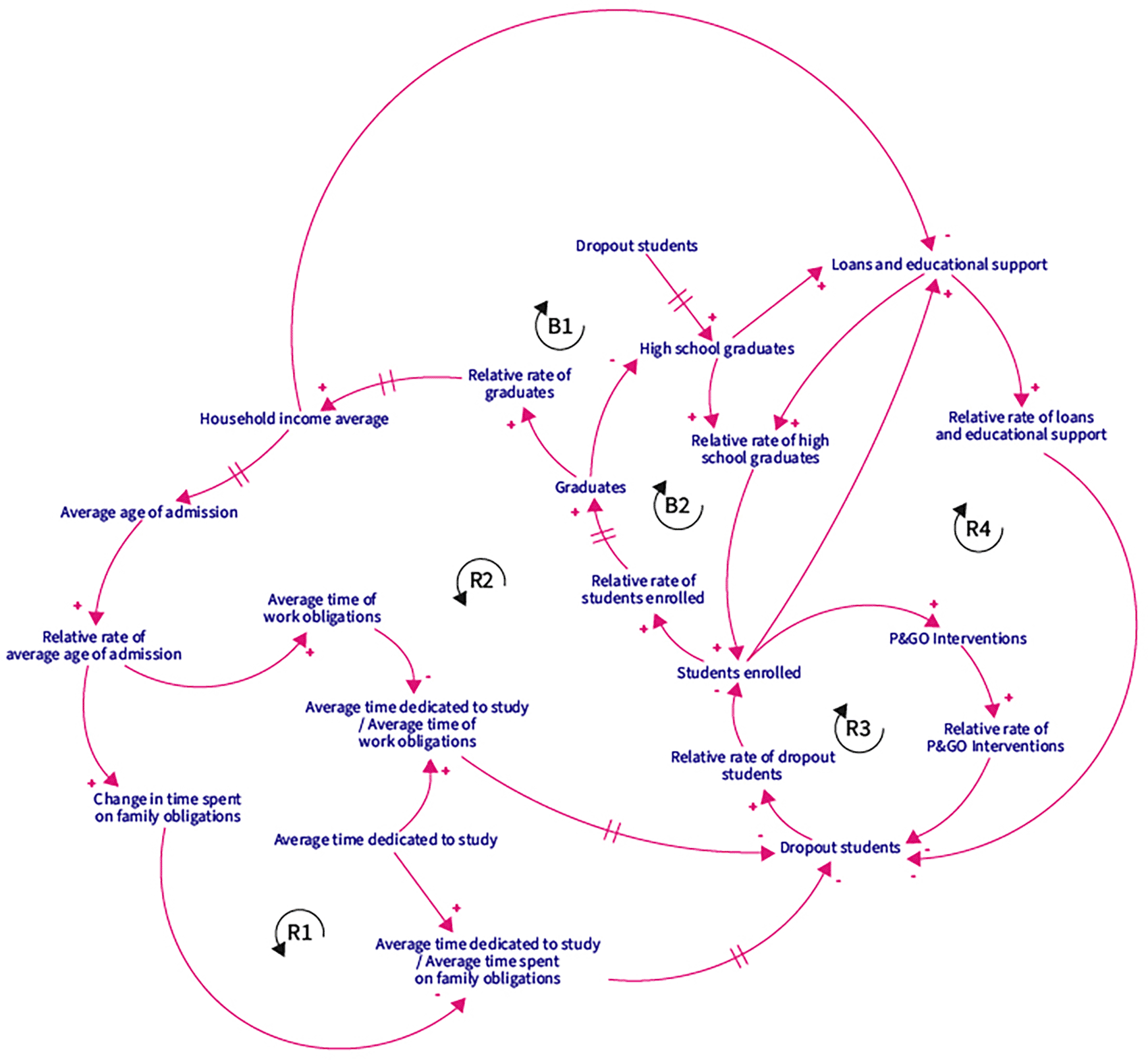 Regarding the first balancing loop B1, the greater the number of dropouts, the fewer enrolees and graduates, decreasing the average family income. In the event of a low average family income, the number of credits and educational aid granted by the state will increase to prevent dropouts. For the B2 balancing loop, the greater the number of high school graduates, the higher the number of students enrolled in higher education, and the number of graduates, decreasing the number of people with only high school degrees.