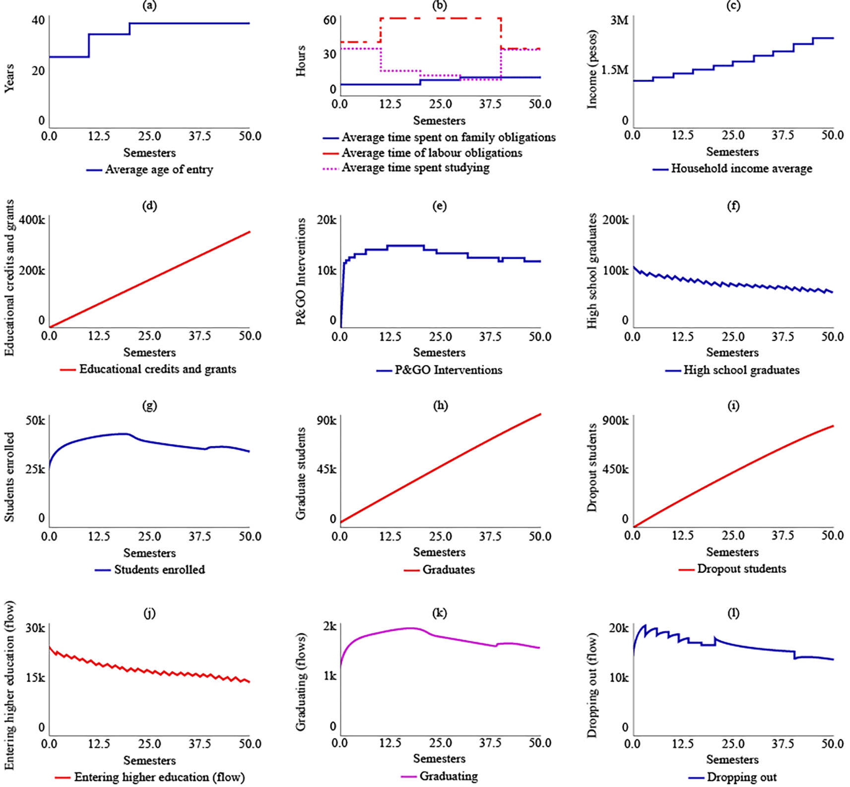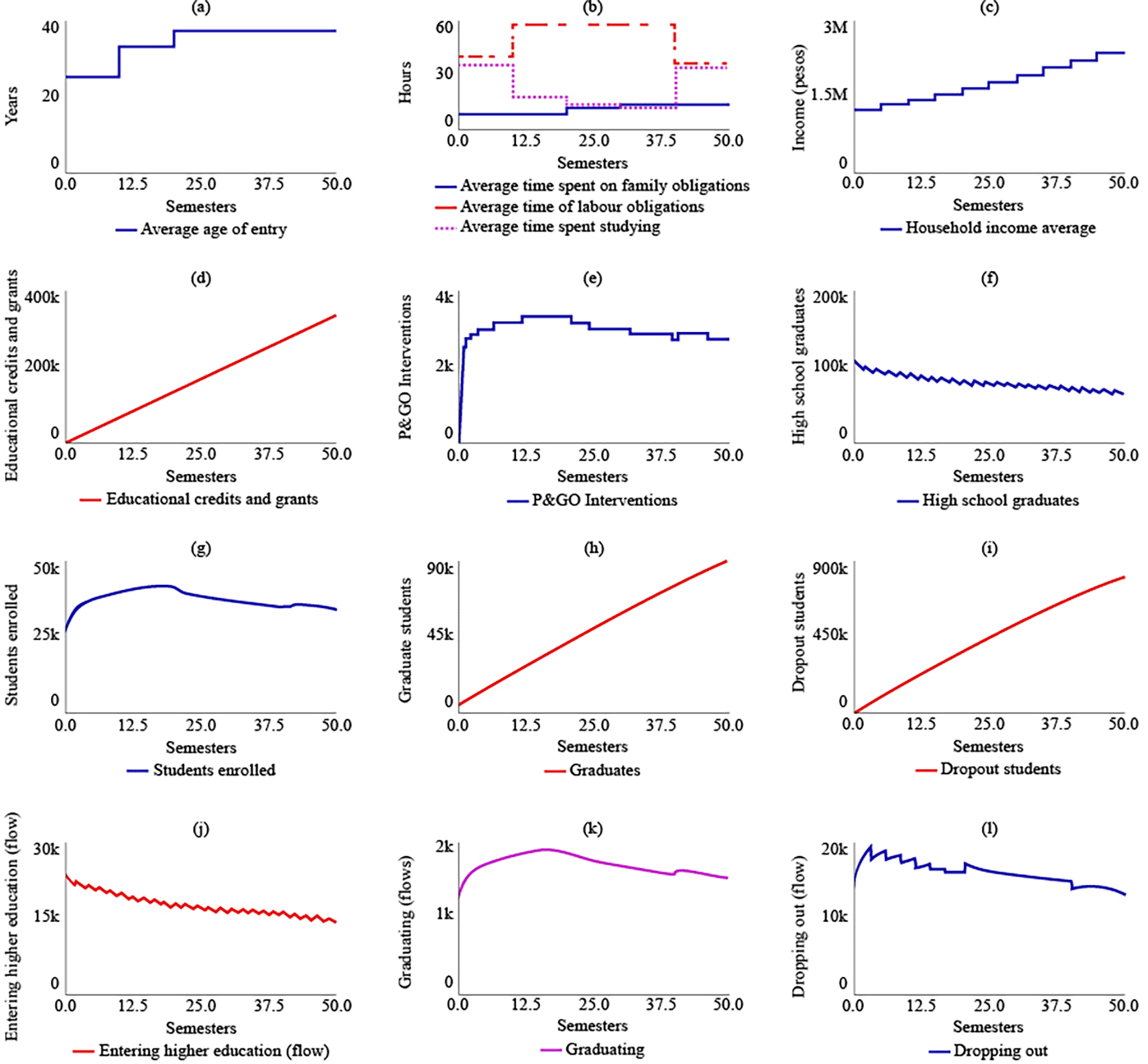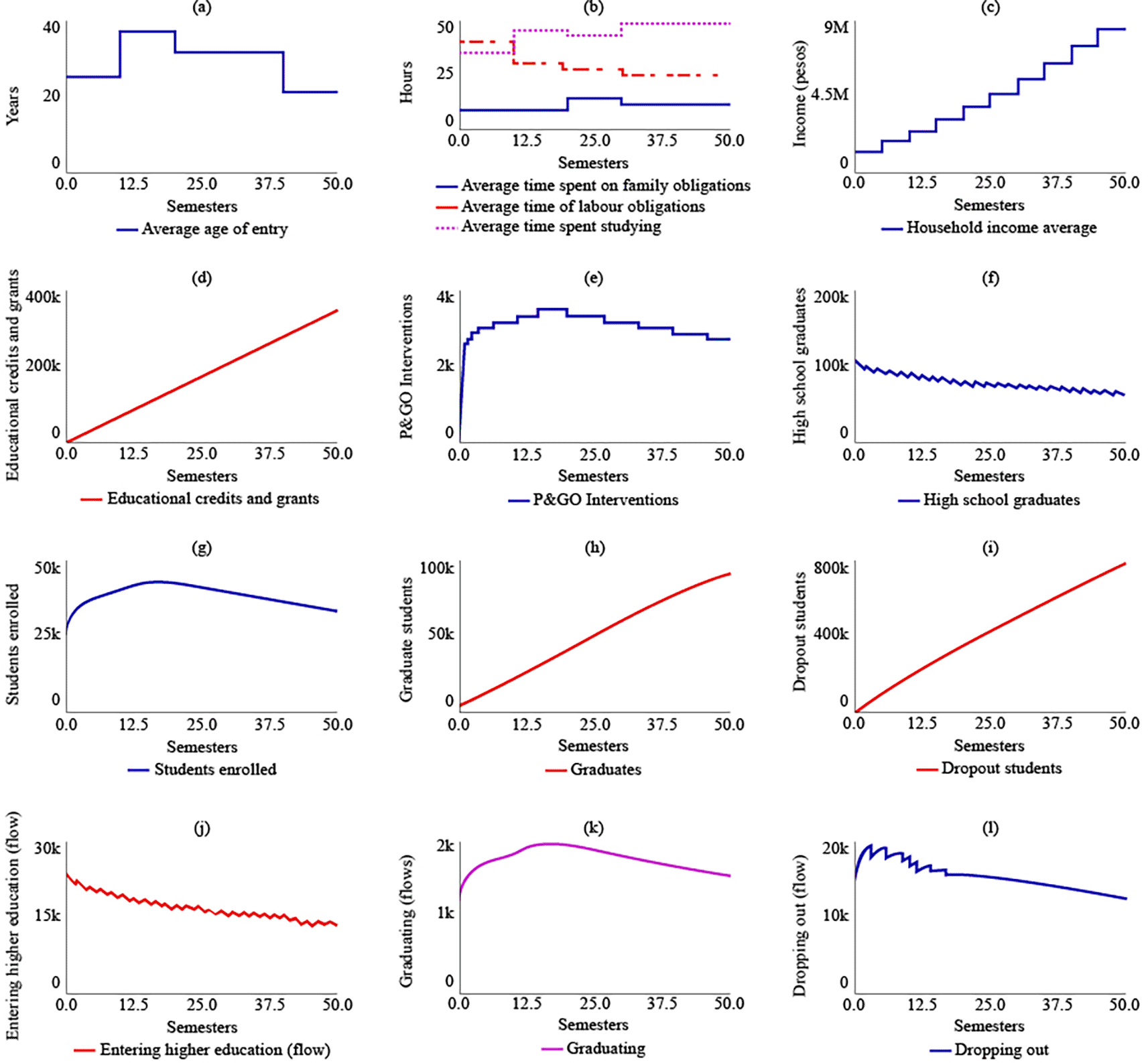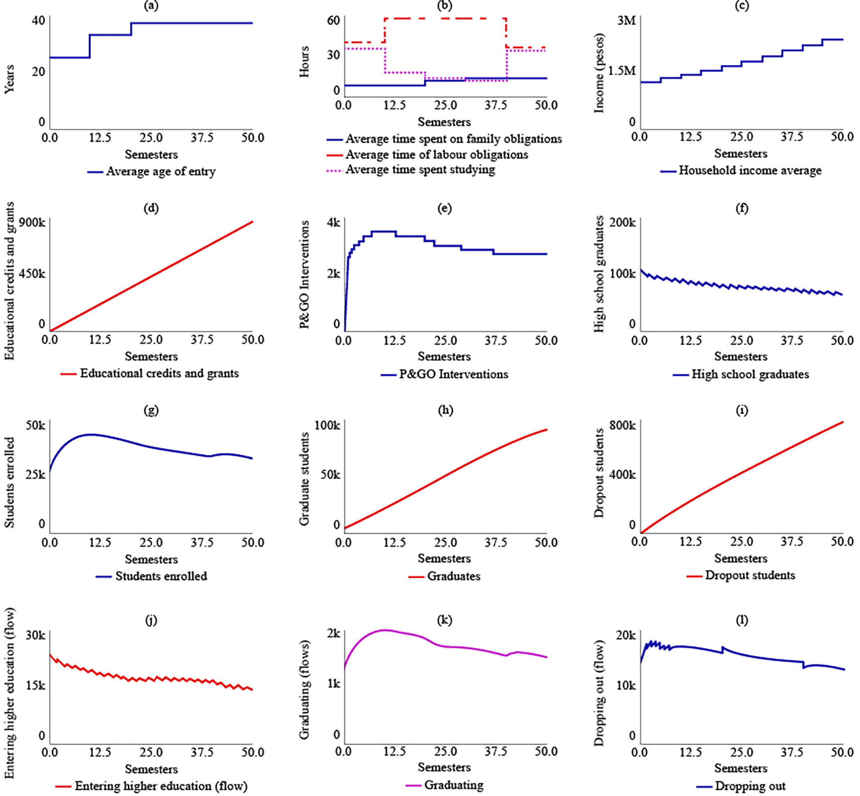 In the case of SIM-3, where there is an increase of $500,000 COP in the average family income, the average age of admission changes compared to SIM-1. Between t = 10 and t = 20, the average age increases by 12 years compared to the initial age of 25 years. However, after t = 20, the average age would decrease and reach 21 years for t = 50. As a result, there would be a readjustment in the distribution of the average time devoted to family, work, and study obligations, with 11.4, 24.7, and 48 hours allocated to each, respectively, for t = 50. In the year 2041, if the family income increase policy remains fixed due to the effect of State subsidies, the average family income is estimated to be $8,470,000 COP (USD 1,804.16). The number of educational credits and grants delivered would be $341,000 COP for t = 50. The maximum number of P&GO interventions would occur between t = 14 and t = 20, with 3,570 intervention sessions, and subsequently decrease. The behaviour of high school graduates would continue to decrease, with 61,000 for t = 50. However, the level variables of enrolled students, graduates, and dropouts would stabilize at 33,600, 92,600, and 773,000, respectively, for the year 2041. Figure 5 displays the results of SIM-3.