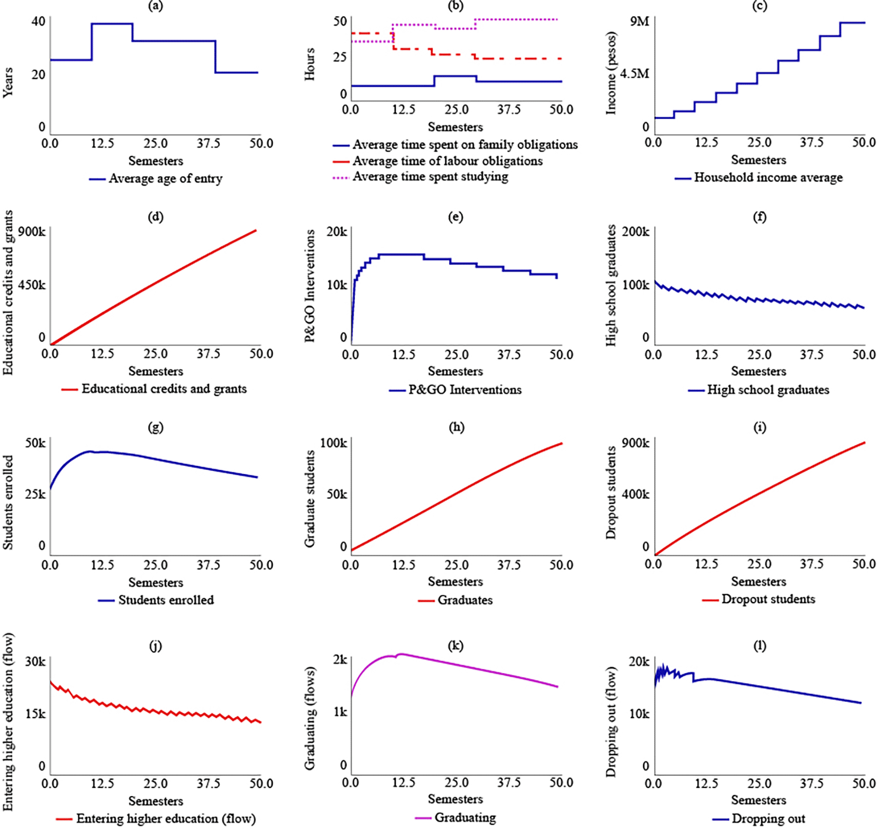 In this scenario of multiple policies, the number of subsidies delivered would reach 866,000 by t = 50. Similarly, between t = 6 and t = 18, it is estimated that the P&GO interventions would reach their maximum point at 15,600. After this period, the interventions would decrease, being equal to 11,600 by t = 50. As for the number of high school graduates by t = 50, there would be 59,900, with a decreasing curve from t = 1. The number of enrolees, graduates, and dropouts would be 32,900, 93,100, and 751,000, respectively, by t = 50. Figure 7 displays the behaviour of this simulation scenario.
