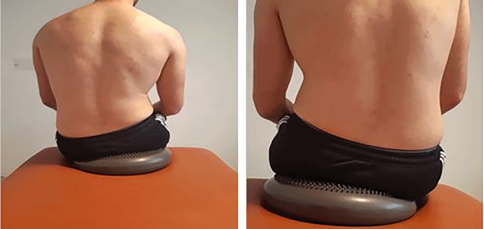 Exercise 1. Sitting on the balance cushion. Inclination and declination of the pelvis (Figure 1). Performed 8-10 times.