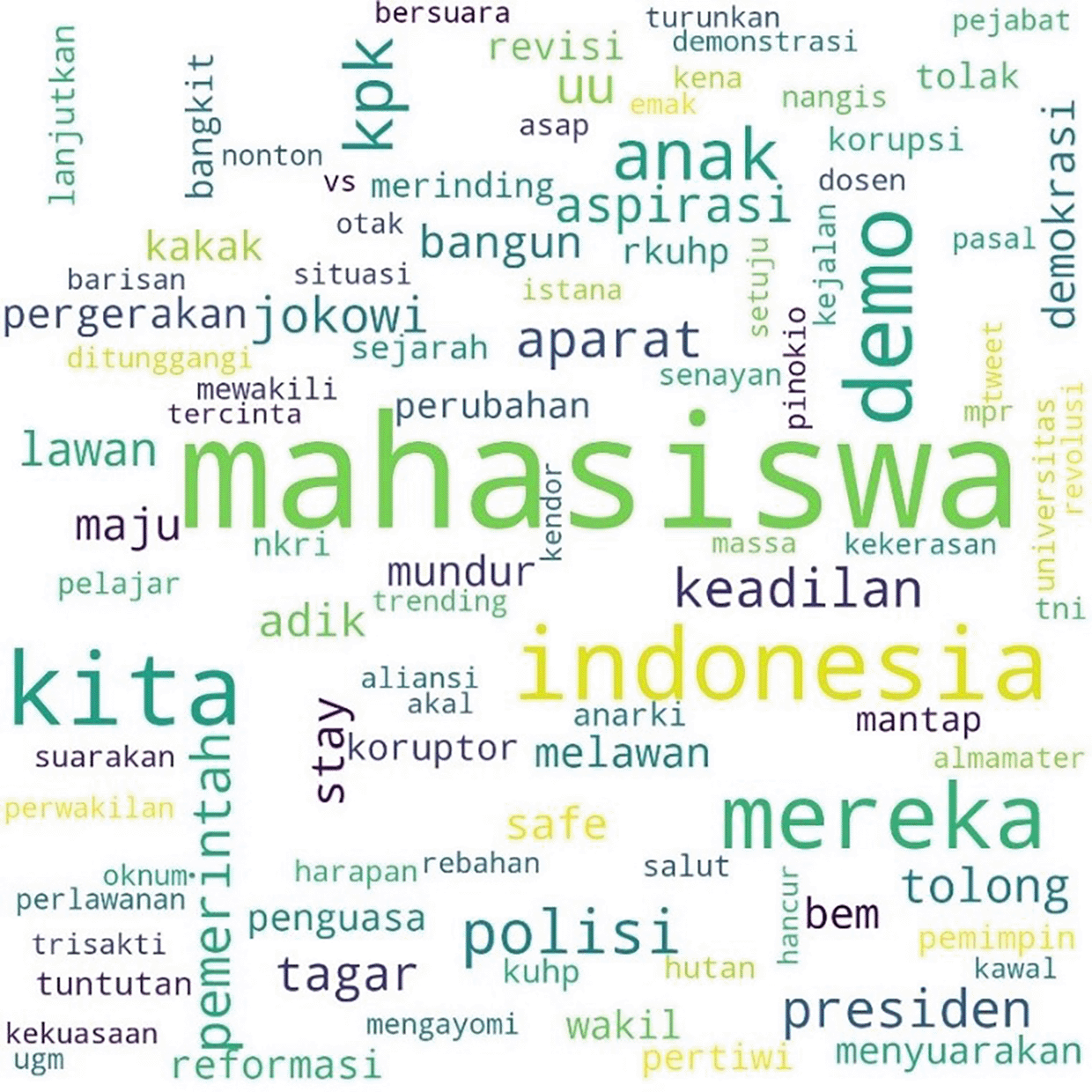 Throughout this article, we provided an overview and understanding of the phenomenon of youth involvement in two critical movements in Indonesia since the Reformation began in 1998, namely the 2019 #ReformasiDikorupsi and the 2020 #TolakOmnibusLaw. Specifically, we focused our investigation on youth engagement in digital-based social movements on Twitter. Using data mining techniques, we confirmed that youth groups, especially students and millennial K-Poppers, actively participated in the movement and mobilized it by generating hashtags and expanding conversations on Twitter. The emergence of a digital society allows for mutual connection and expansion of the venue for freedom of expression as well as a form of active participation in political developments at the state level. Thus, this group of youth provided a valuable contribution to the development of democracy in Indonesia. Although the activism of young people on social media is massive, this movement is inseparable from the large-scale demonstrations that took place offline in many large cities in Indonesia. In this case, the two movements, online and offline, influenced each other. The online medium constituted a recruitment space for building, framing, and mobilizing the offline movement. As Cammaerts (2015) highlights, activism in social media can involve three activities: mobilization and recruitment, channeling communication, and direct action opposing the government’s policies. Mobilization and recruitment took place before and during the offline movement. One example is #gejayanmemanggil, or gejayan calling, referring to Gejayan, a meeting point in Yogyakarta where students gather and consolidate offline. As alternative communication channels, social media facilitate activists’ self-mediation by distributing goals and framing movements more efficiently and enable activists to transmit text and visual discourse, as well as afford opportunities for communities and subordinate groups to build alternative collective identities. Direct actions were communicated effectively in social media, helping construct the binary opposition of “Us” (#Kita) and “Them” (#Mereka).