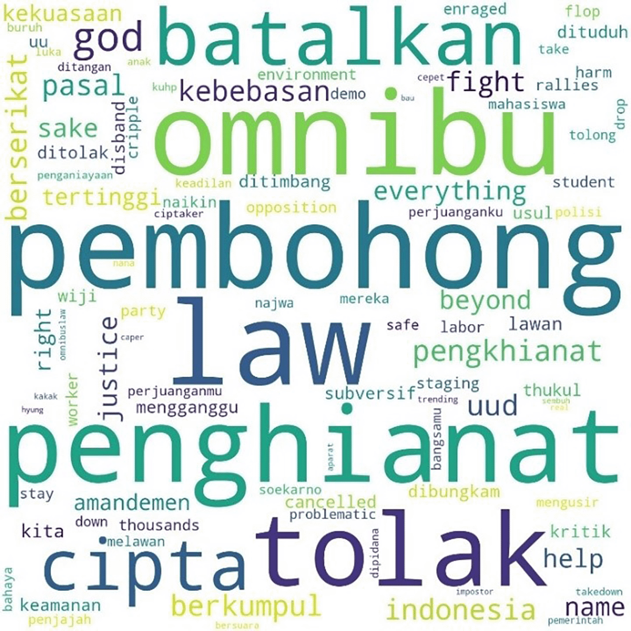The most mentioned hashtag, #TolakOmnibusLaw, first appeared on October 6, 2020, at midnight. In Figure 4, we can see that the words #student and #mahasiswa were less widely used than words such as #pembohong (liar), #penghianat (traitor), or #Omnibus. This shows that the conversation was dominated by the substance of the criticism and did not focus on the actors as in #ReformasiDikorupsi. Apart from #Omnibus, #liar, and #traitor, criticism was expressed in a strong language such as #reject, #annul, #freedom, #fight, #right, and #justice.