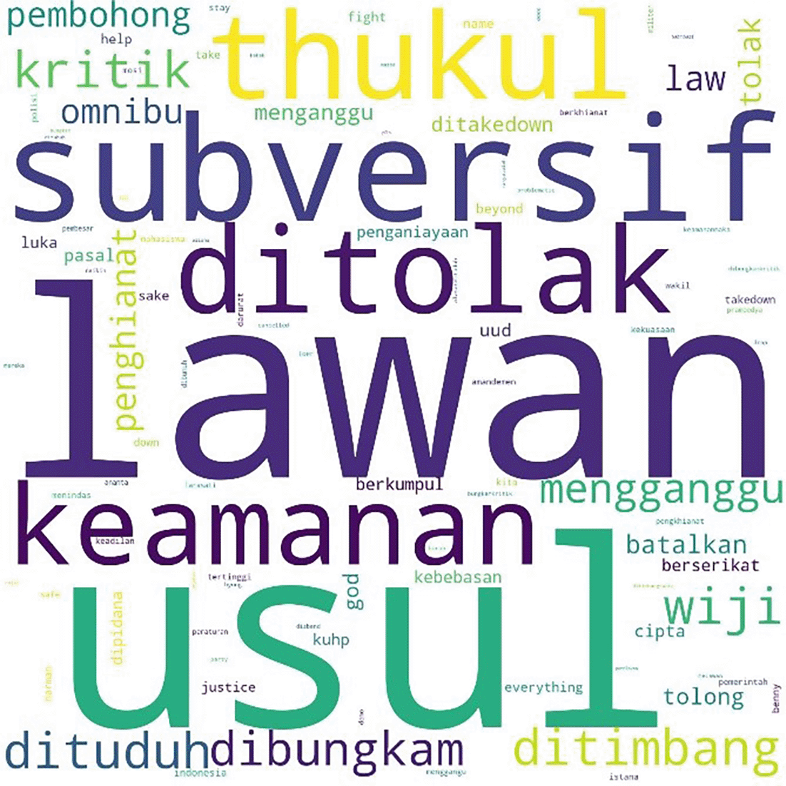 Two days after the initial mention of #jegalomnibuslaw, another hashtag, #jegalsampaigagal was first mentioned at 00:00:16. In Figure 7, we see that conversations with this hashtag were dominated by the word “fight” (lawan), a word often quoted from a poem by Widji Thukul, a pro-democracy activist who disappeared in 1997 for his “subversive” and critical poems. The words Widji, Wiji, Thukul, and #lawan were used repeatedly and dominated conversations during the Tolak Omnibus Law movement.