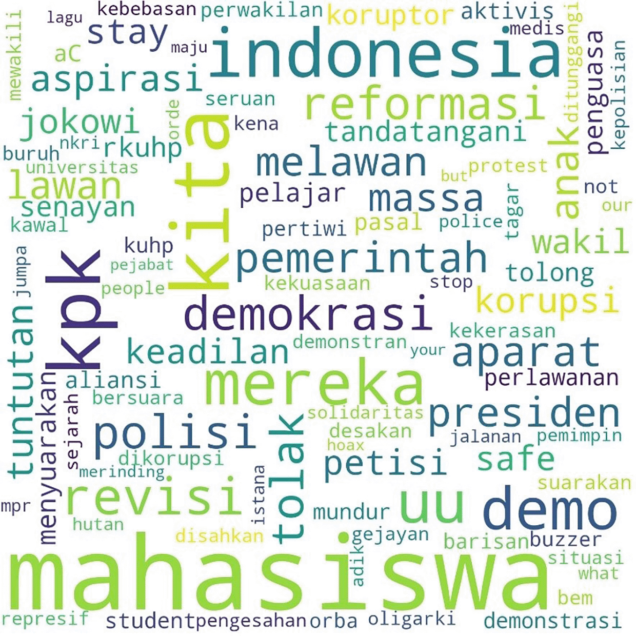 In Figure 1, #Students is the most talked-about term, showing students as the main subject in the movement. Student entities are described as #us, or us, and the targets of criticism as #them or them. Those who fall into the “our” category in this movement besides students are #pelajar or secondary students, #labor or labor, and #activists or activists. Several student entities were also discussed, including #BEM, the executive student organization in universities, and #gejayan, which refers to a student mobilization initiative in Yogyakarta. Meanwhile, tweets are addressed to parties such as #Jokowi, #President, #Government or government, #penguasa or rulers, #representasi or representatives, #polisi or police, and #buzzers, namely the influencers on social media who create narratives that defend government policies. The criticisms and concerns raised are the most common conversations, such as #KPK, Indonesia, #Democracy, #reject or reject, #revision or amendment, #UU or Law, and #korupsi or corruption.