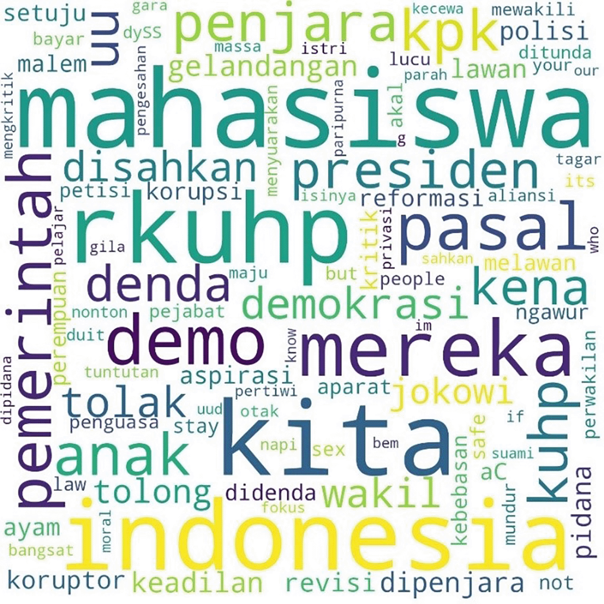 Similarly, the pattern for the hashtag #TolakRKUHP also shows students as the most talked-about hashtag. #Indonesia and #RKUHP or the Criminal Law draft were also extensively discussed in the movement, and as the previous figure shows, the binary opposition between them and us also existed. Figure 2 shows the pattern.