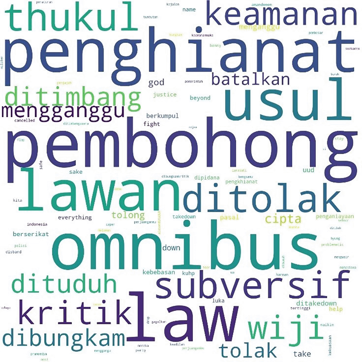 Two days after the initial mention of #jegalomnibuslaw, another hashtag, #jegalsampaigagal was first mentioned at 00:00:16. In Figure 7, we see that conversations with this hashtag were dominated by the word “fight” (lawan), a word often quoted from a poem by Widji Thukul, a pro-democracy activist who disappeared in 1997 for his “subversive” and critical poems. The words Widji, Wiji, Thukul, and #lawan were used repeatedly and dominated conversations during the Tolak Omnibus Law movement.