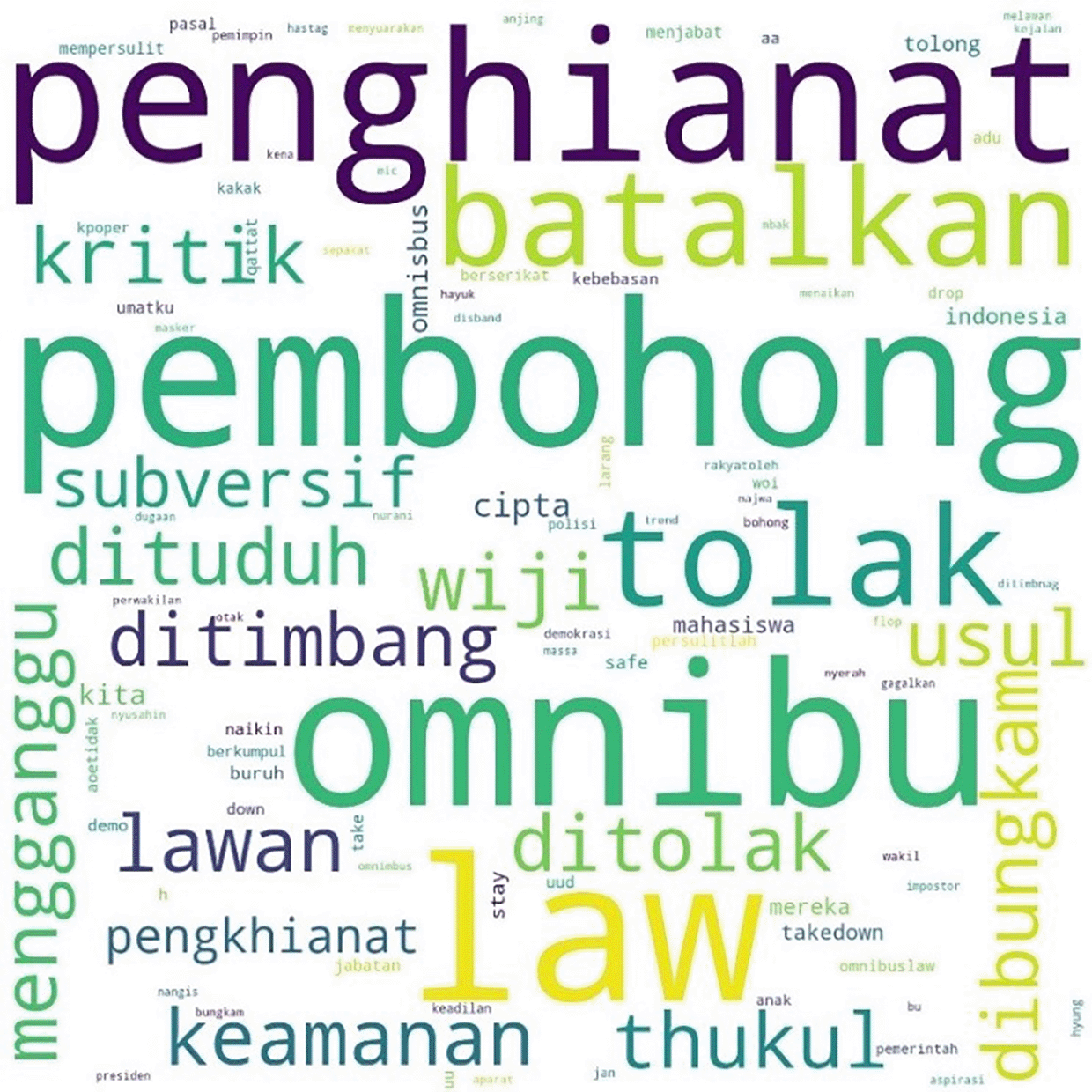 The most mentioned hashtag, #TolakOmnibusLaw, first appeared on October 6, 2020, at midnight. In Figure 4, we can see that the words #student and #mahasiswa were less widely used than words such as #pembohong (liar), #penghianat (traitor), or #Omnibus. This shows that the conversation was dominated by the substance of the criticism and did not focus on the actors as in #ReformasiDikorupsi. Apart from #Omnibus, #liar, and #traitor, criticism was expressed in a strong language such as #reject, #annul, #freedom, #fight, #right, and #justice.