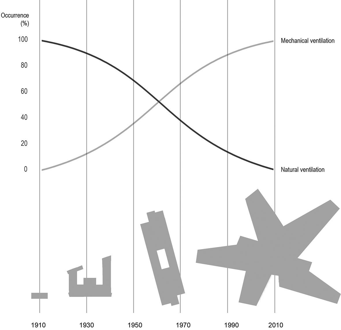Historically, natural ventilation has played a crucial role in the architectural planning of schools, providing an acceptable indoor environmental quality, both during the summer and during the winter period. Often, a good, balanced indoor climate was established in a very low-tech manner; pupils typically spending 45 minutes in each lesson, in high-ceilinged classrooms, often followed by 15 minutes of venting during breaks, in empty classrooms and with children outdoor in the school yard year-round. This meant that in most cases, natural ventilation - which most schools were fully based on until the mid1960s – probably did meet the requirement of CO2 < 1.000 ppm, based on natural air-intake from windows and doors.1 Recent studies document that natural air-intake from windows and doors remains a functional and sustainable solution for schools.2,3 Yet, today the planning of schools is quite different, almost entirely based on mechanical ventilation. See Figure 1. The building codes increasingly demanding mechanical ventilation.4,5 However, also the situation and teaching philosophy is different today. First of all, schoolchildren spend more time indoors. According to a report from Organization for Economic Cooperation and Development, OECD (2016),6 Danish pupils spend a total of 10,960 hours on school education. This is considerably more time than the European average of 7,540 hours. Secondly, lessons tend to have a longer duration today, the children often having 2-period lessons corresponding to 1.5 hours. Thirdly, the architecture of the schools has changed. Together with energy renovation and air-tight mechanically ventilated buildings, new types of classrooms have been introduced, such as project space schools and open-plan schools. Older schools however, built before 1995, still have traditional classrooms based on natural ventilation through the windows. These schools make up 90% of all schools in Denmark according to a Danish study from 2016 by Toftum and Wargocki.7 According to the study, more than half of these existing schools in Denmark (1,300) suffer from a poor indoor air quality. Only 40-44% of Danish schools had a “good” indoor air quality (CO2 below 1.000 ppm). This indicates that traditional, natural ventilation through windows and doors may not be sufficient anymore.