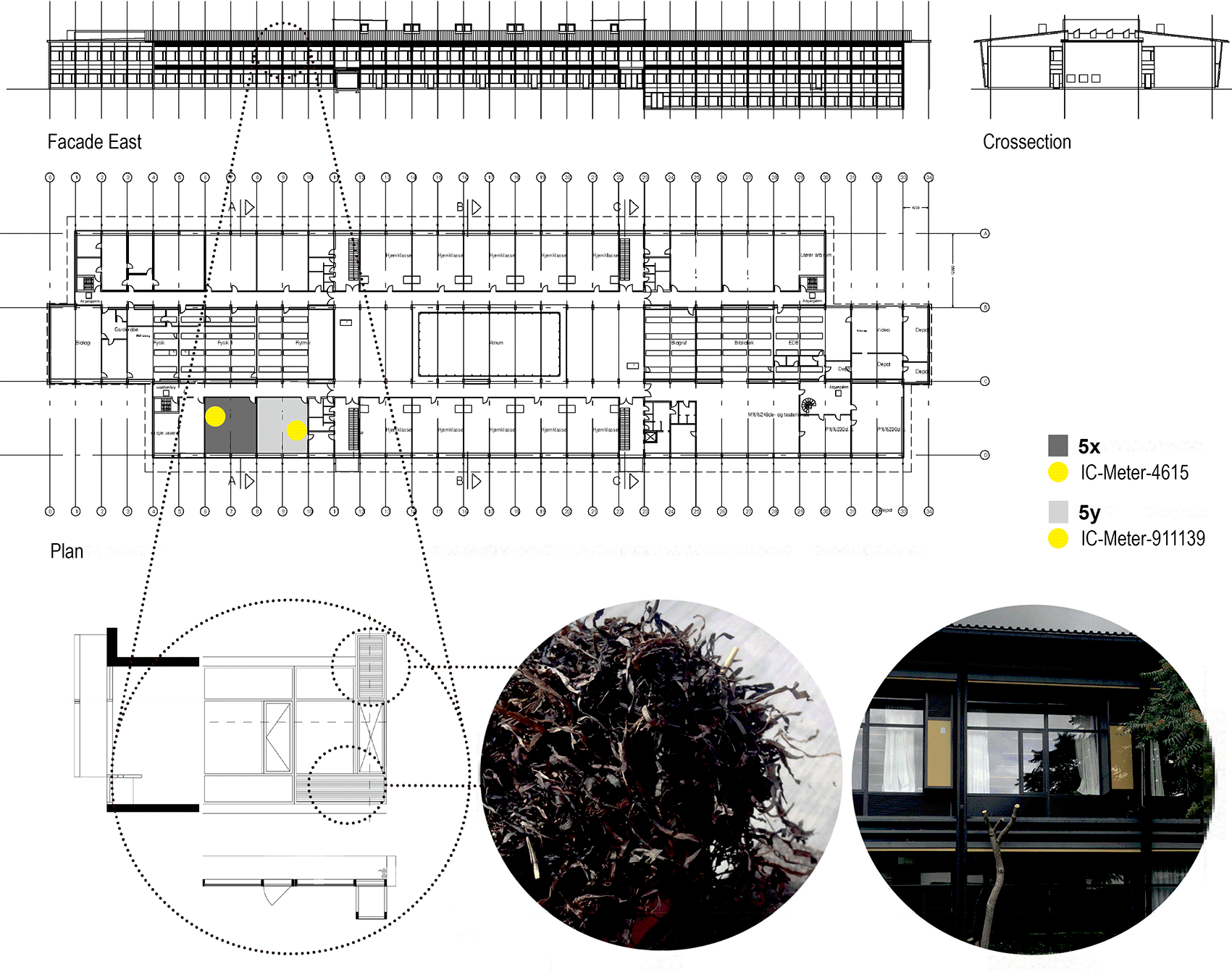 The system introduced traditional, vernacular materials such as eelgrass combined with natural ventilation using intelligent demand-control technology. Natural materials such as eelgrass are known to have a antimicrobial effects, because of its natural salt-content and antimicrobial secondary metabolites.20 Traditionally, eelgrass was applied in mattresses and indoor furnishings, etc. When applied in larger quantities, these natural materials help maintain a higher, more natural, relative humidity, being a hygroscopic building material, absorbing and releasing moist. In this way, eelgrass helps balance the humidity, maintaining a relative humidity above 40% RH, which is a recommended minimum threshold value for a healthy environment.21,22