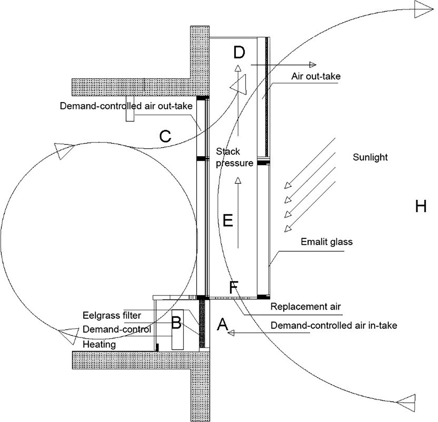 The total outlet area of NOTECH was 0.7 m2 and had a maximum air velocity of approximately 0.3 m/s. The air intake was 2.1 m2, approximately three times larger than the outlet area, allowing lower airflow speed at high air change per hour (ACH), without the risk of draught. At the same time the NOTECH system was designed to reduce noise, using eelgrass as acoustic material. The NOTECH system also included two supplementary solar chimneys, enabling potentially higher ventilation rates during sunny days. The solar chimneys may potentially have an effect, especially on the summer ventilation, causing more passive cooling/ventilation during sunny days (Figure 3). This effect was not studied in this project.