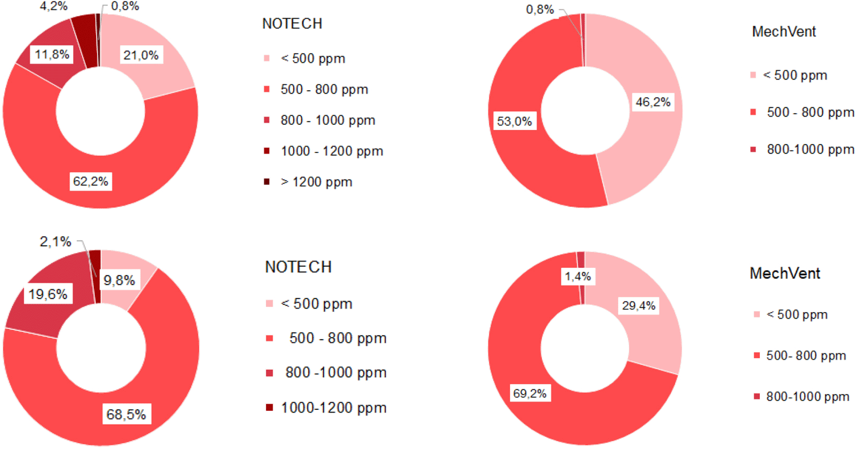 Indoor classroom CO2 levels were lower than 1.000 ppm for 100 % of school hours for the mechanical system and 95% of the school hours for the NOTECH system in the summer period 2019 and winter period 2020 (Figure 4). CO2 levels above 1.000 ppm were reached for the NOTECH system in short periods of 10-15 minutes, 5 % of the usage time, and only during the summer period (Figure 4). CO2 levels for the mechanical system generally were lower than for the NOTECH system (Figure 5). On average during the summer and winter period, the CO2 levels were 600 ppm for the mechanical vs. 800 ppm for the NOTECH system. Higher CO2 levels were reached during the summer period than during the winter period for the NOTECH.