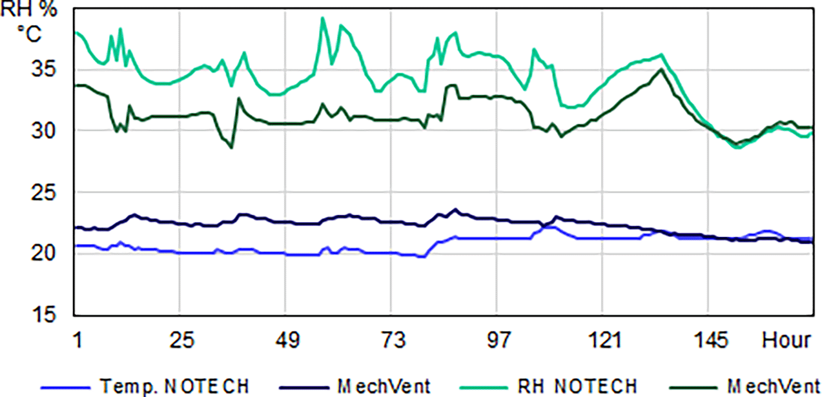 Typical hourly average levels for NOTECH natural ventilation compared to mechanical ventilation (MechVent). Because NOTECH uses cold “fresh” outside air, the indoor temperature is lower (20 °C) and the relative humidity (%) higher compared to mechanical ventilation.