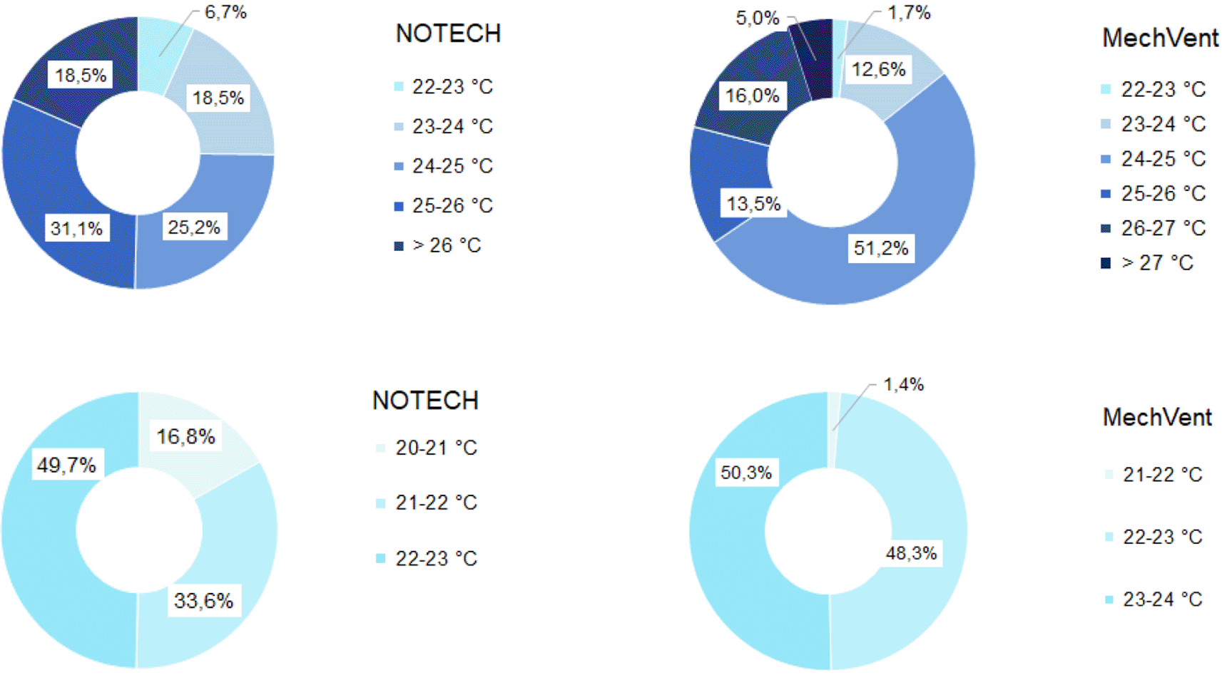 Temperatures during winter were generally colder for the NOTECH system, with the lowest temperatures recorded between 20 and 21°C, observed 16.8% of the usage time, whereas no temperatures below 21°C were observed in the classroom with the mechanical system.