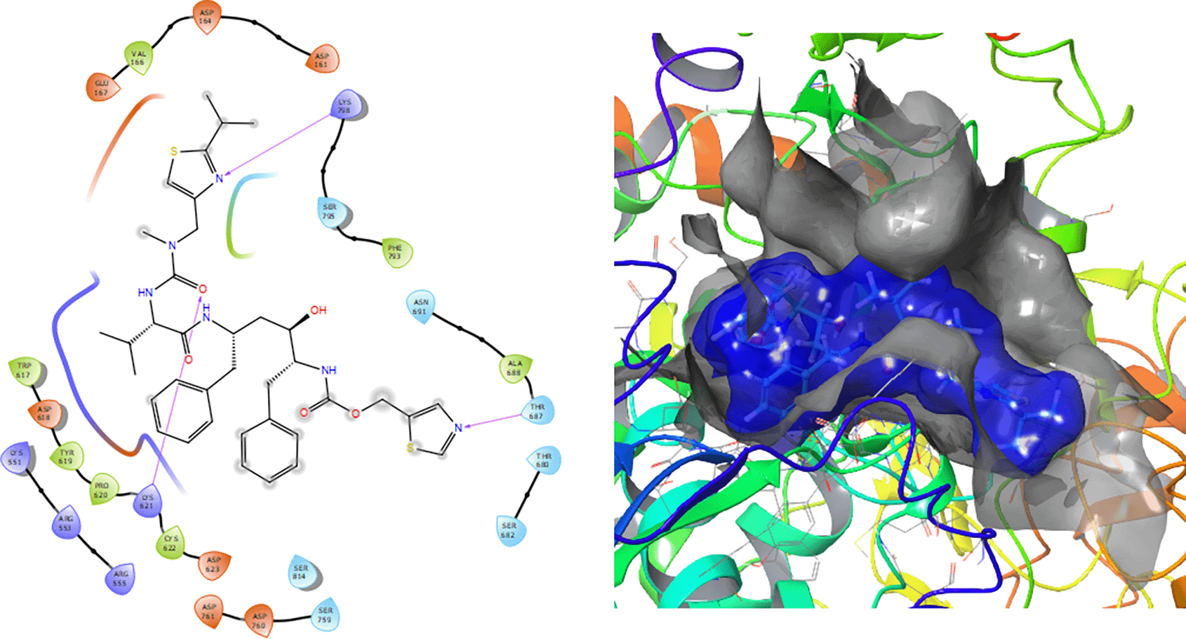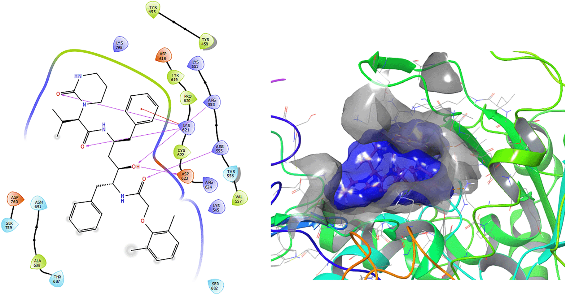 Ritonavir has a -H bond with the residues LYS298 and LYS621 with a length of 1.26Å and 1.43Å (Figure 5). Also has a H-bond with the residue THR687 with a length 1.13 Å, respectively.