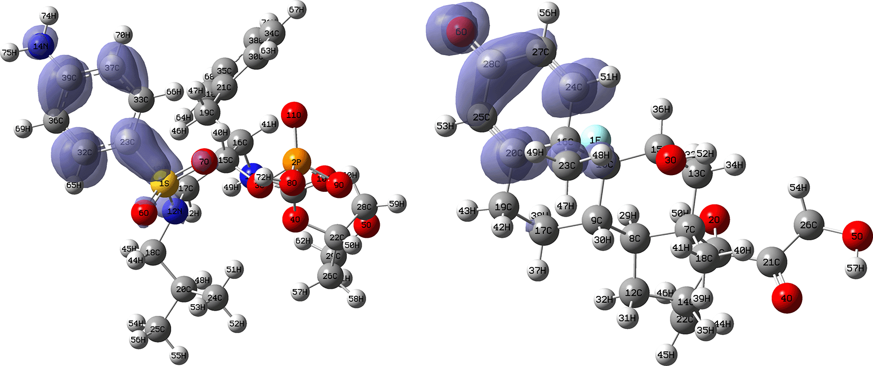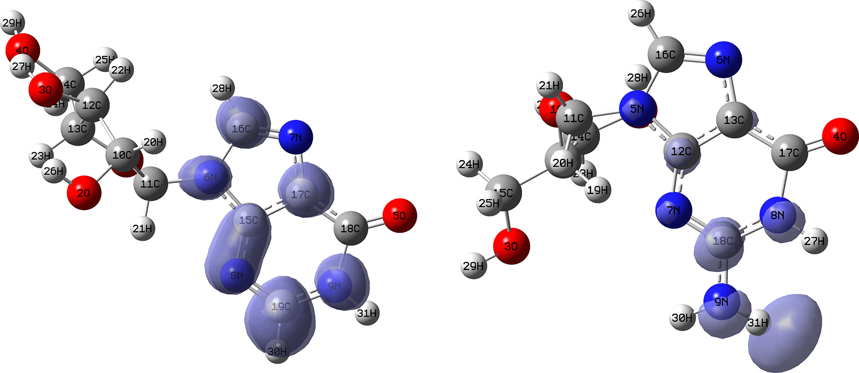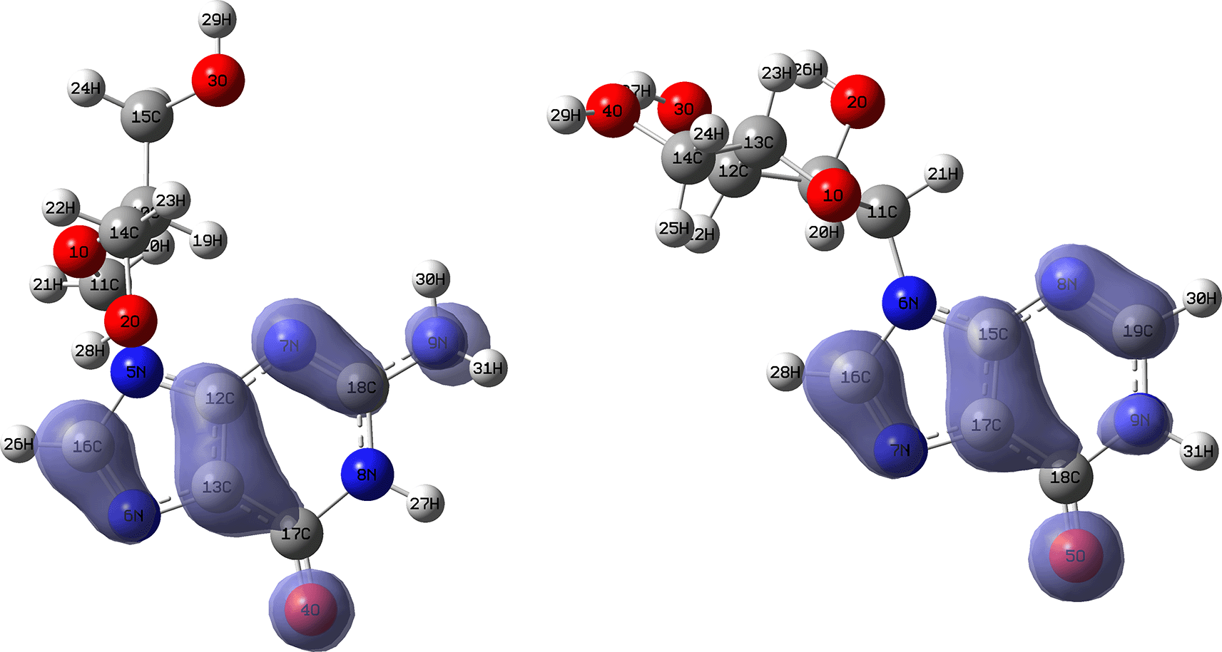 Figures 10 and 11 show the Fukui and functions corresponding to the Insoine and Ganciclovir ligands. Figure 10 shows a strong similarity between the two functions, which may indicate that both ligands have a similar nucleophilic behaviour and/or that they have a similar tendency to donate electronic charge. On the other hand, Figure 11 shows significantly different descriptor functions so we would expect different electrophilic behaviour for these ligands and/or a very different tendency in relation to the possible charge-withdrawing interactions. The Fukui Functions maps were obtained using Highest Occupied Molecular Oribital (HOMO) maps and the Lowest Unoccupied Molecular Orbital (LUMO) maps).