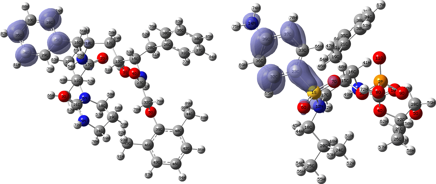 Figures 12 and 13 show the Fukui functions for the ligands Lopinavir and Fosamprenavir. In Figure 12 it can be seen that there is no similarity between the two functions, indicating that the ligands have different nucleophilic behaviour and/or show a different trend in electronic charge donation. On the other hand, Figure 13 shows descriptor functions with a certain resemblance so we would expect comparable electrophilic behaviour between these ligands although the similarity is moderate. Figure created using Schrödinger suite 2017-1.