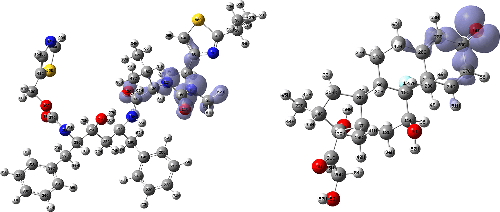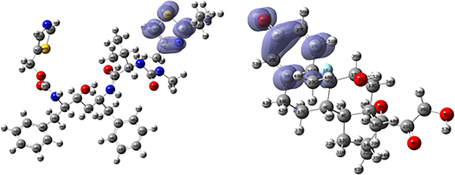 Figures 18 and 19 show the Fukui functions for the ligands Ritonavir and Dexamethasone. In Figure 18 it can be clearly seen that there is no similarity between the two functions, so we think that these ligands have different nucleophilic behaviour. On the other hand, Figure 19 shows descriptor functions with a certain resemblance, so we would expect comparable electrophilic behaviour between these ligands, although the resemblance is very limited.