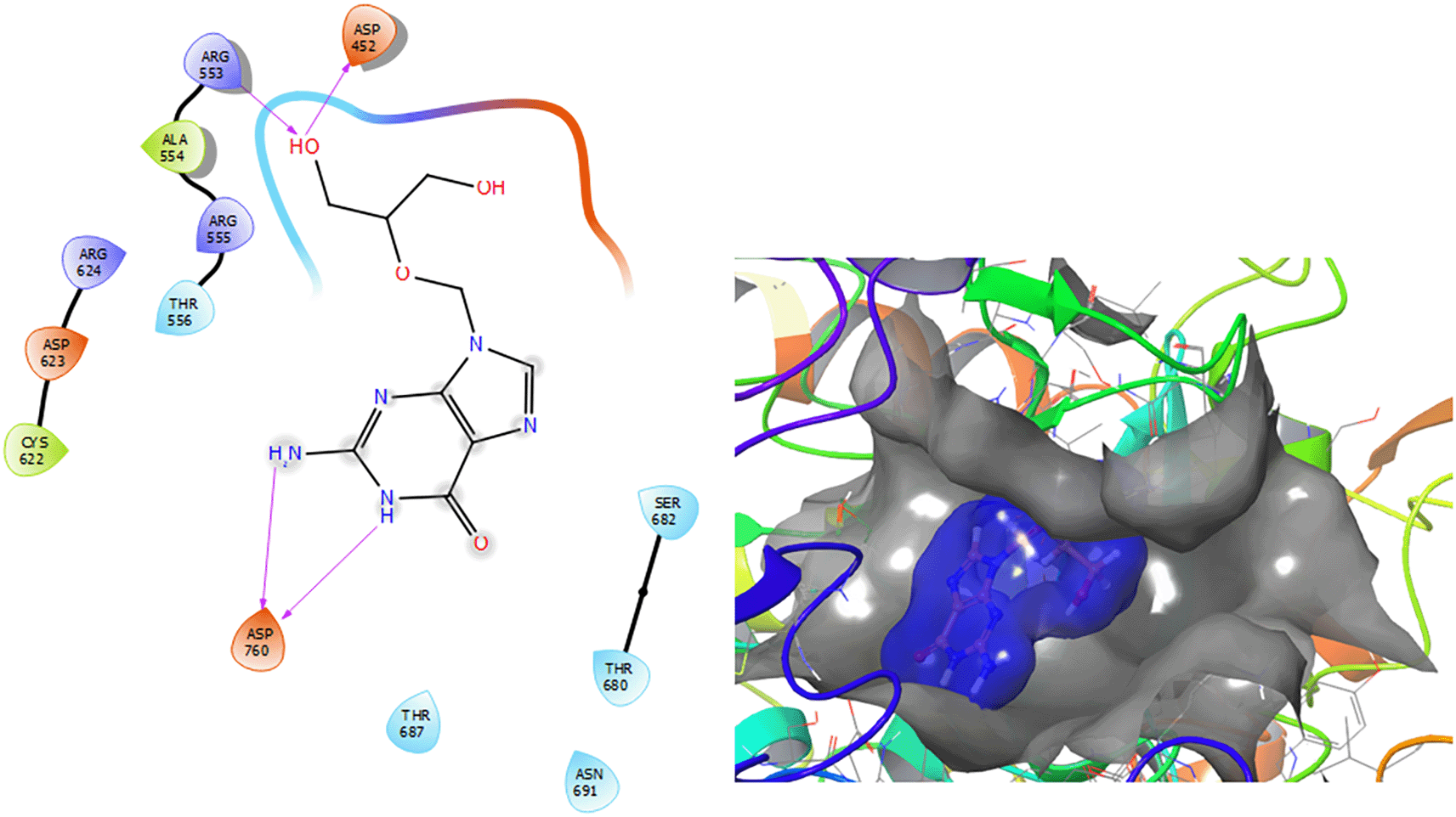 Figure 2 shows that the Ganciclovir compound has a H-Bond with the residue ARG553 with a length of 1.58Å and ASP452 with a length of 1.62Å. Also, this compound has two H-bonds with the residue ASP760 with lengths of 1.59Å and 1.63Å, respectively.