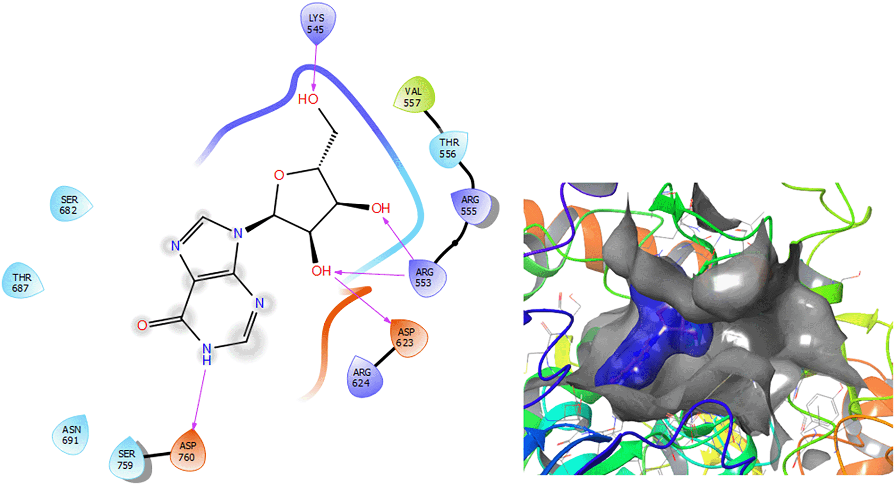 Figure 3 shows that the Insoine compound has a H-bond with the residue ASP760 with a length of 1.65Å, with the residue ARG553 have two H-bonds with lengths of 1.58Å and 1.61Å, respectively. Finally, it compounds have a H-bond with a length of 1.48Å.