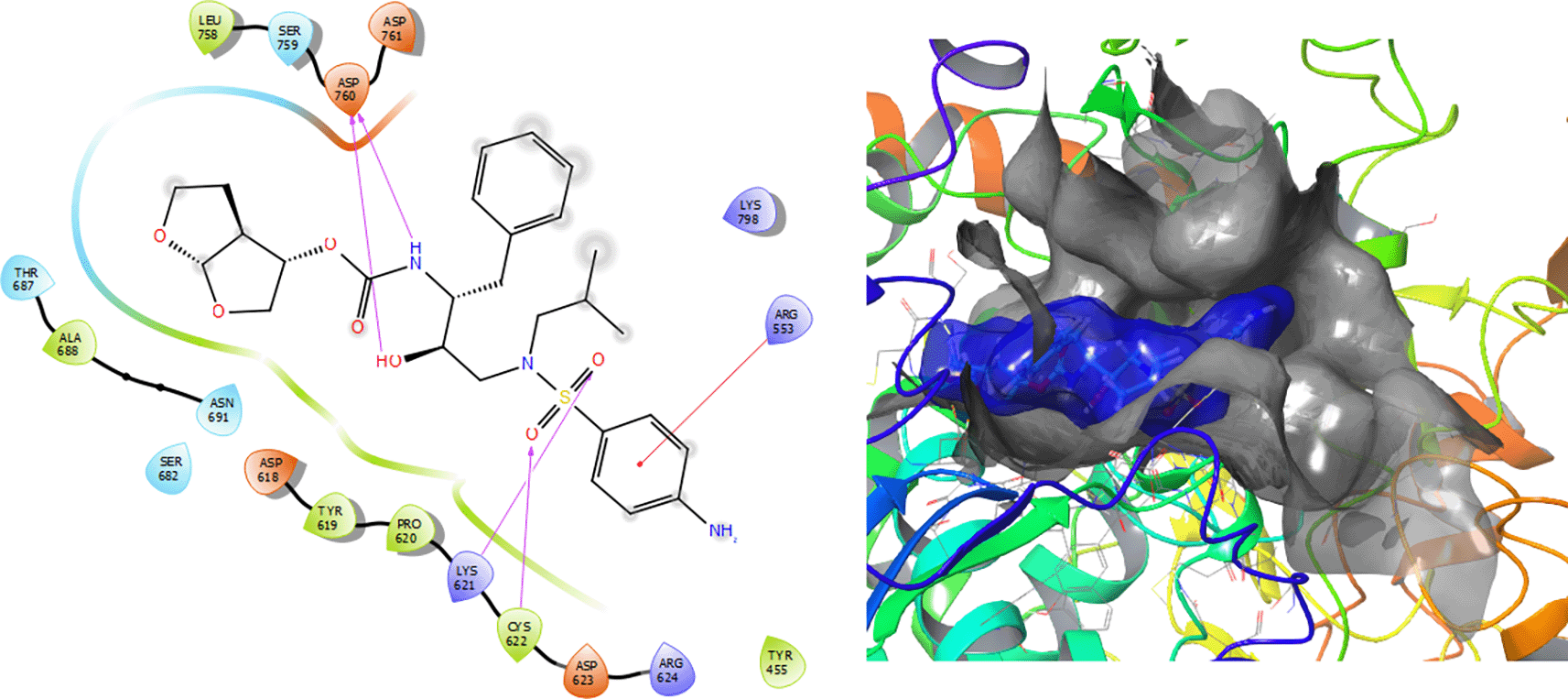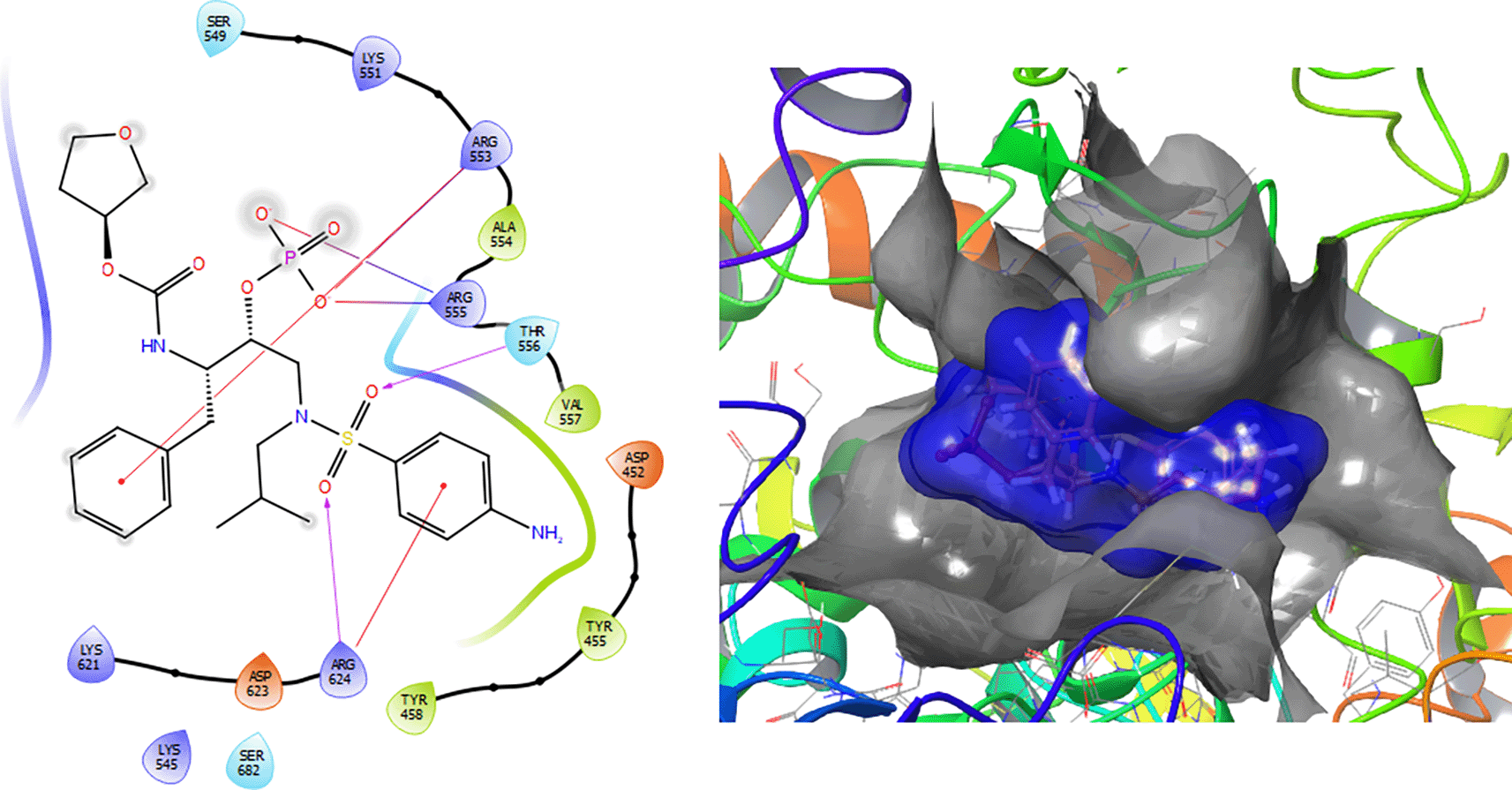 The Fosamprenavir compound has two a π–π stacking interactions with the residue ARG624 with a length of 1.62Å, another interaction with the residue ARG553 with a length of 1.82Å (see Figure 4). Also have a H-bond with a residue ARG553 with a length of 1.62Å, another H-bond with ARG624 with a length of 1.57Å and with the residue THR556 with a length of 1.61Å.