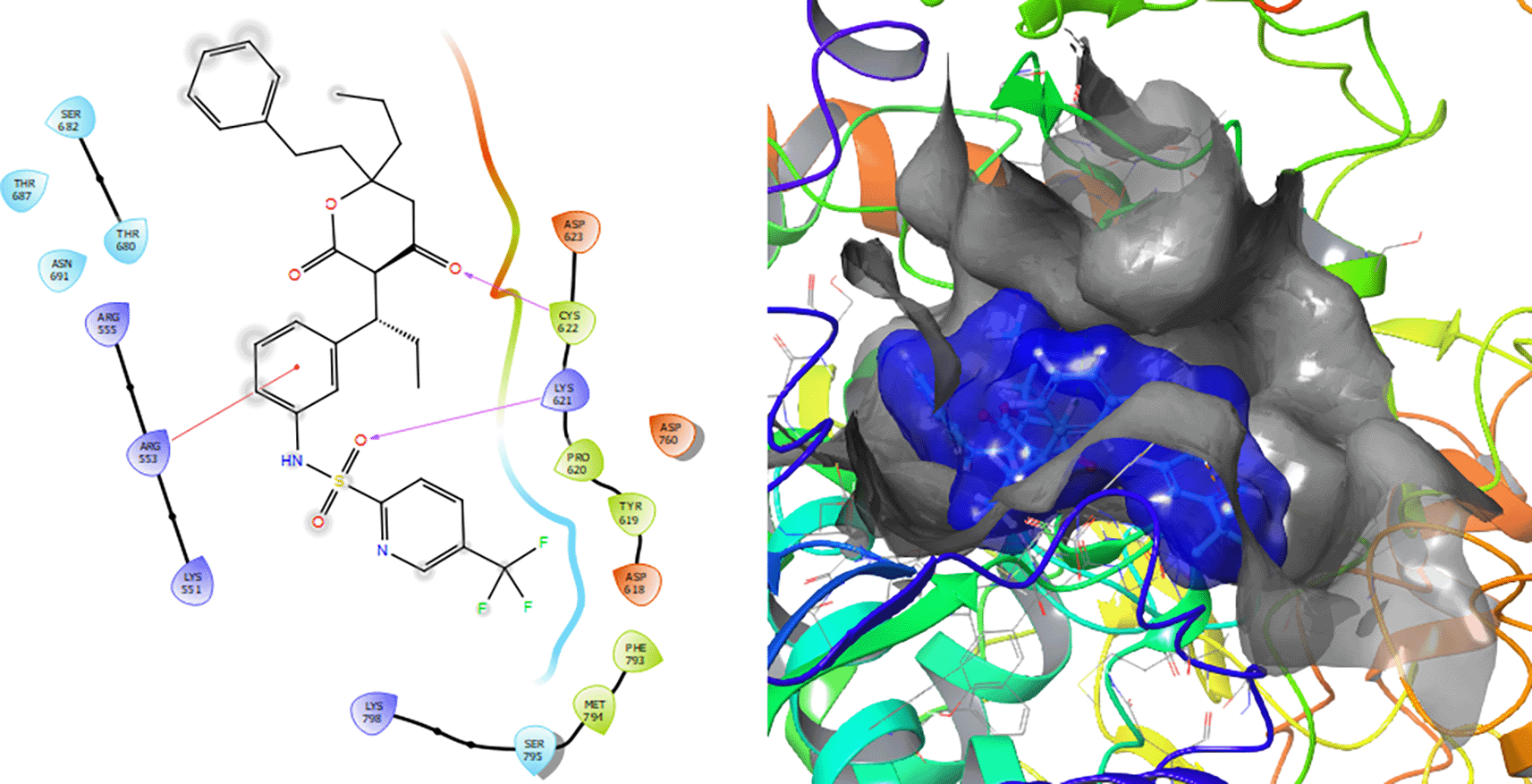 Figure 7 shows that the Tipranavir compound has a π–π stacking interactions with three H-bonds with the residue CYS622 with a length of 1.66Å, with a residue LYS621 with a length of 1.63Å and a π–π stacking interactions with length of 1.46Å.