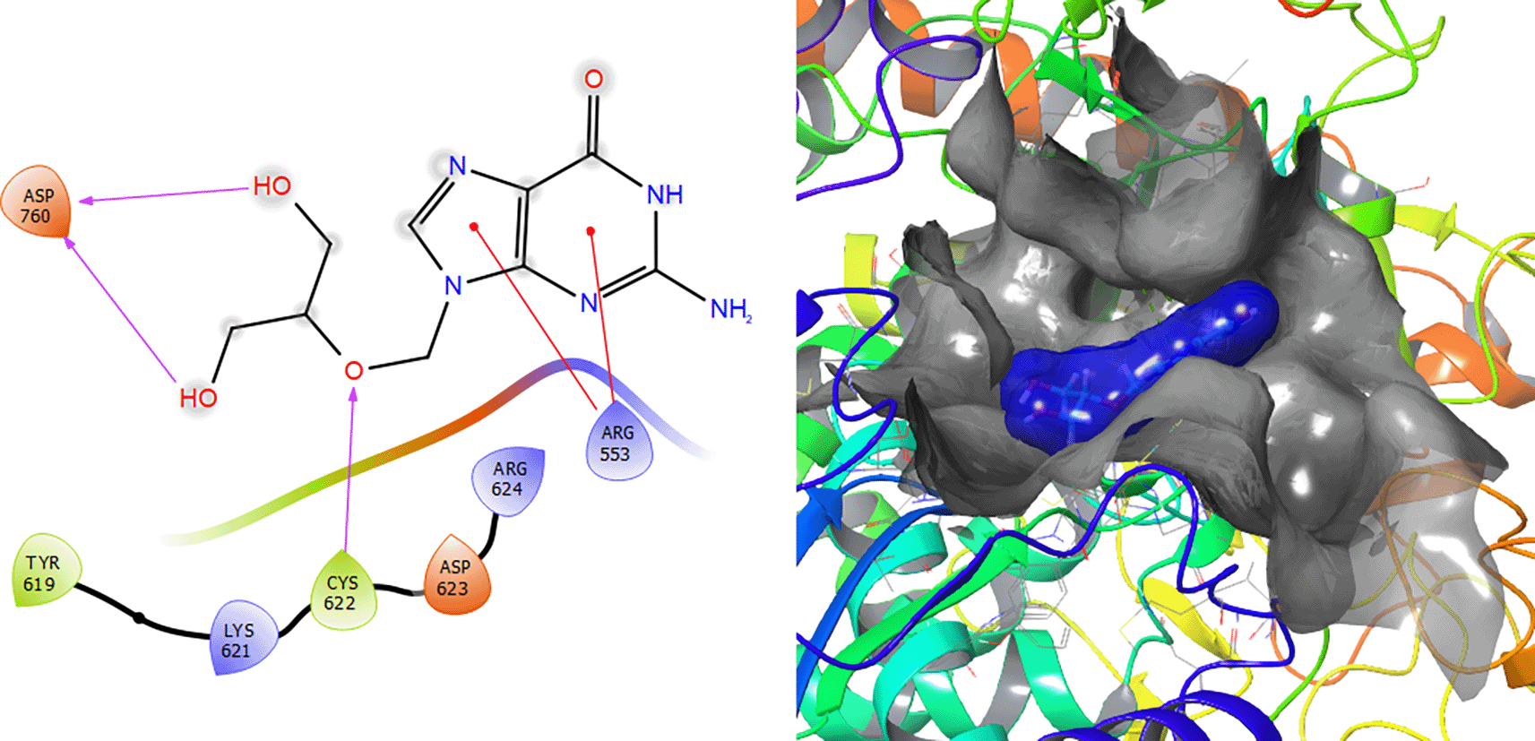 Ganciclovir compound has two π–π stacking interactions with the residue ARG553 with lengths of 1.52Å and 1.61Å (see Figure 8). On the other hand, it compounds have a H-bond with the residue CYS622 with a length of 1.58Å and two H-bonds with the residue ASP760 with lengths of 1.61Å and 1.71Å, respectively.