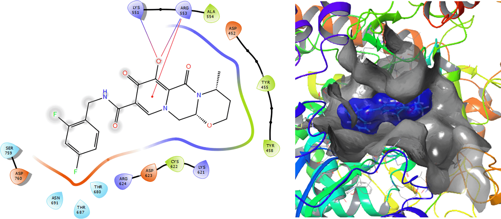The Molecular docking results for Dolutegravir (see Figure 9) involves a π–π stacking interactions with lengths of 1.64Å and two H-bonds with the residues LYS551 and ARG553 with lengths of 1.57Å and 1.59Å, respectively.