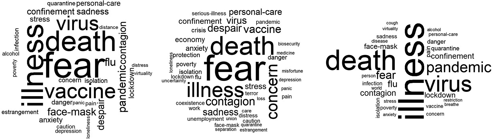 In Figure 1, three word-clouds related to the category of “knowing-living together” are presented. The inducer was: ideas about the pandemic. The cloud located on the left shows the spontaneous (own) verbal associations and in the center and on the right, substitution verbal associations (classmates and family, respectively). The four words that appear most frequently were considered for the analysis. In the first cloud, words such as: illness, death, virus and pandemic stand out; in the center: fear, illness, death and vaccine; Finally, the cloud on the right show’s associations such as: fear, death, illness and concern.