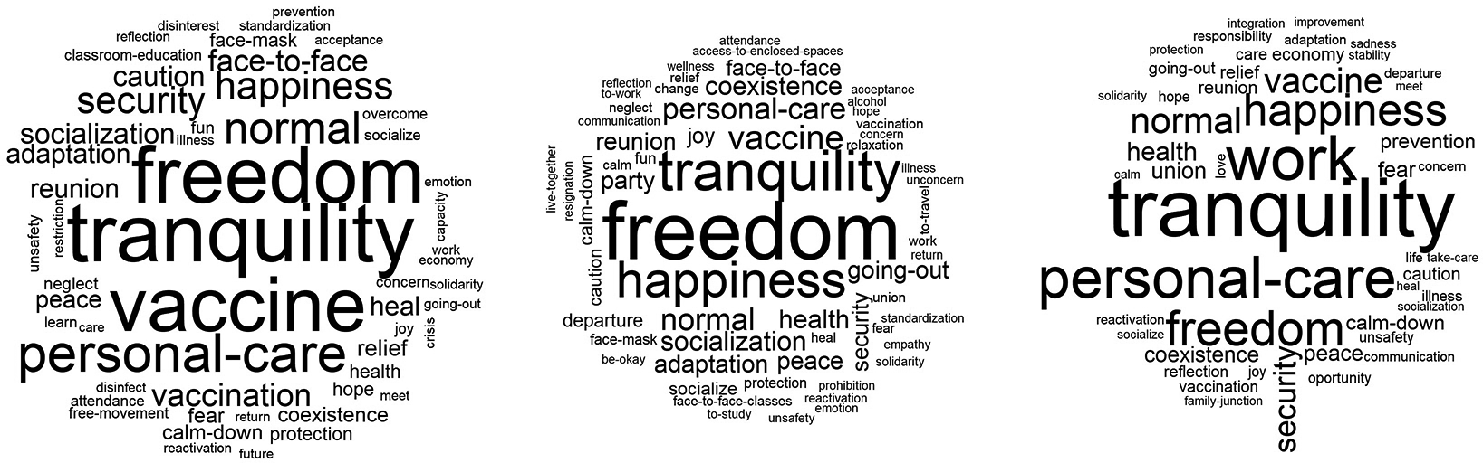 In relation to the “knowing-living together” dimension in the post-pandemic (Figure 2), personal conceptions are represented in the cloud located on the left: tranquility, freedom, vaccine, and personal care; in the middle, referring to classmates: freedom, tranquility, happiness, and vaccine; and on the right, related to family: tranquility, work, personal care, and freedom. In summary, they integrate freedom-tranquility in a personal way; for classmates, freedom-tranquility; and for family, tranquility-work. In the end, due to its frequency, hierarchy and connotation, the core conception would be tranquility, learning as the contrast, and freedom on the periphery.