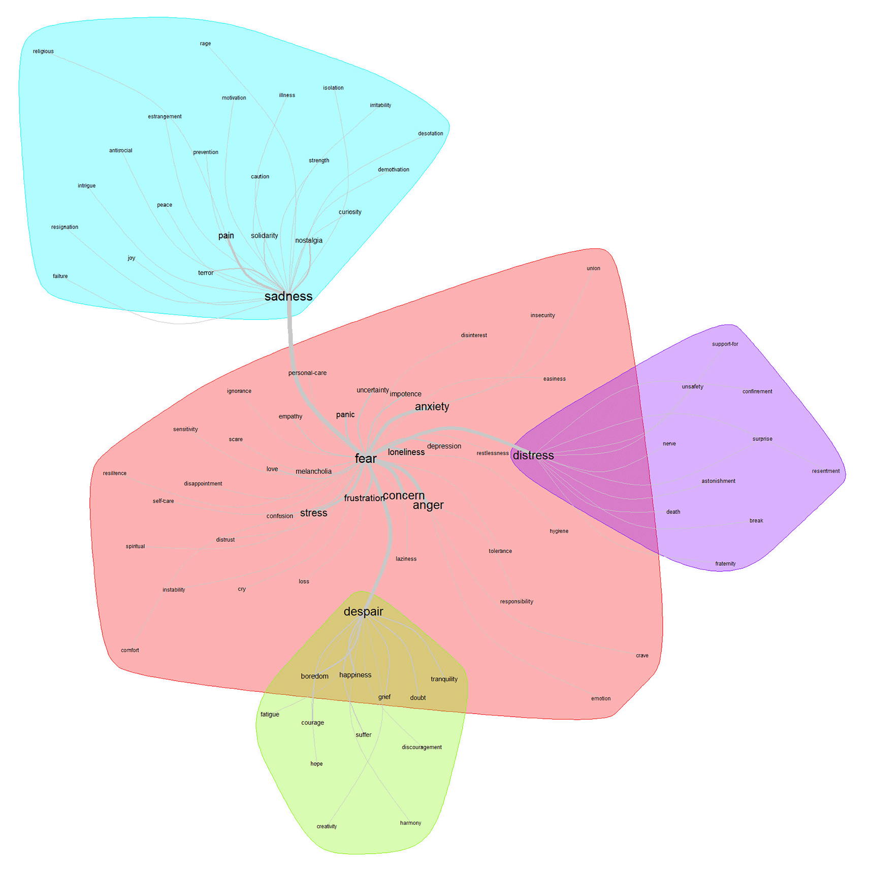 Figure 3 shows four lexical classes. As can be seen, “fear” appears as the core of the central class and it is strongly articulated with three more lexical classes: despair, distress, and sadness. Discursively connected with the core class: “fear”, 38 terms appear. However, linked with thicker lines, due to their semantic proximity (co-occurrence) and larger size of the words (frequency), the following are more relevant: concern, anger, anxiety, and stress. For greater specificity, based on a deeper analysis which integrates revisions of frequency and connotation, the conception that stands out as the core is fear; as the contrast, depression; and, for the periphery, loneliness.