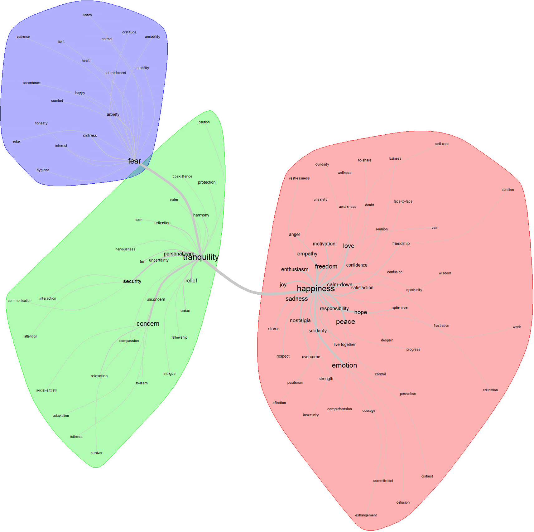 For Figure 4, the lexical class that stands out as the core in the area of feelings related to the post-pandemic is tranquility. This articulates two more classes: fear and happiness. On the periphery of the core class, 28 related terms appear.