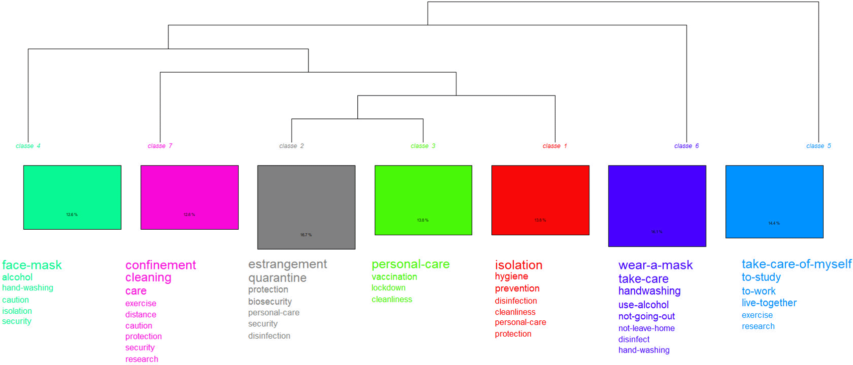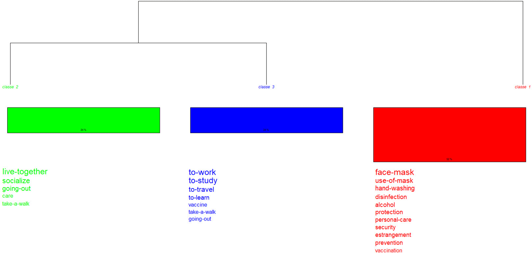 In this dendrogram (Figure 6) two partitions are also displayed. The first one (class 1) records biosafety measures: use of a mask, hand washing and others; the second branch, made up of classes 2 and 3, shows the procedures that became part of everyday life: living together, working, studying, and socializing. By integrating other analyses, the procedure, “personal care” appears as the core; vaccine, as contrast; and take a walk, on the periphery.