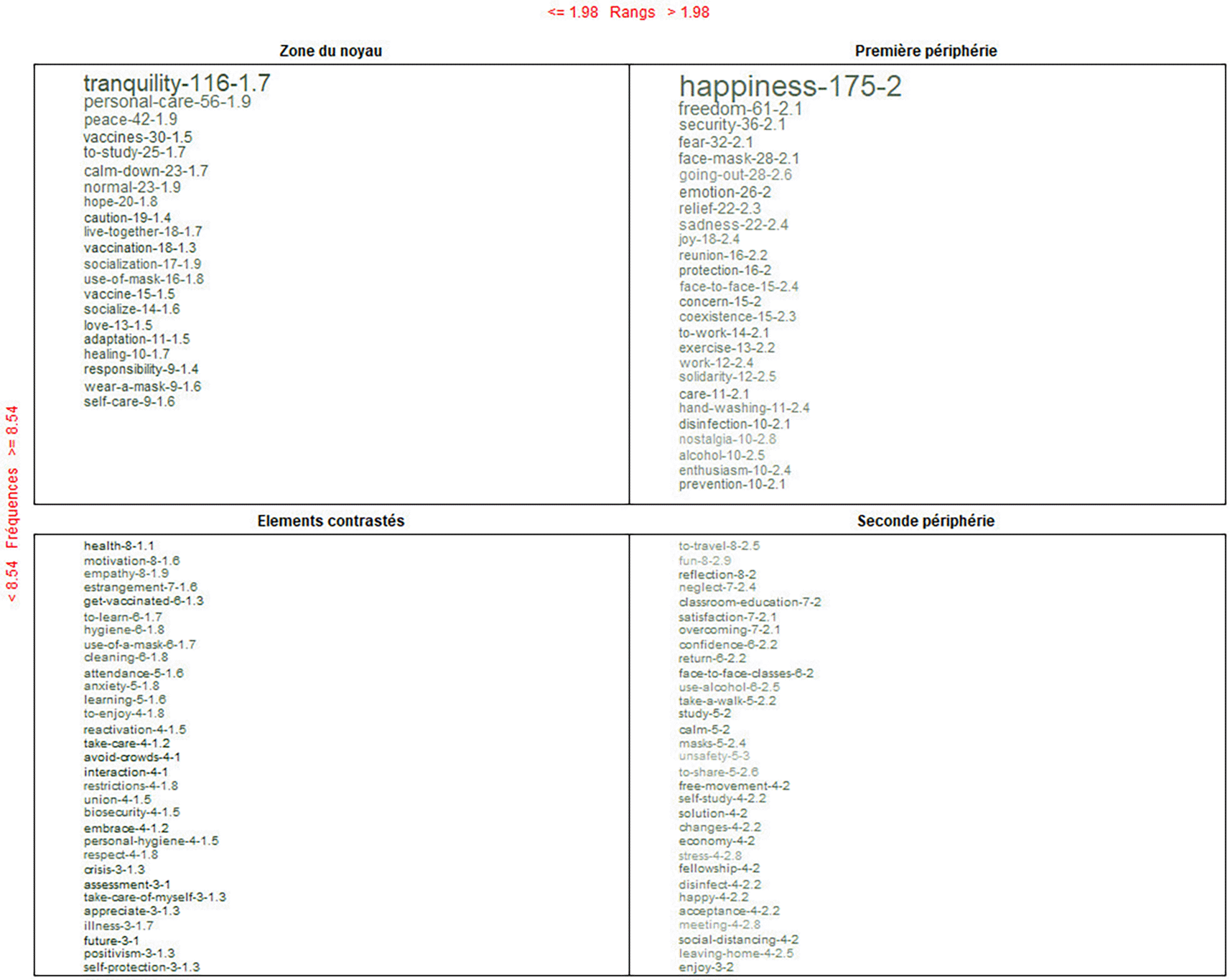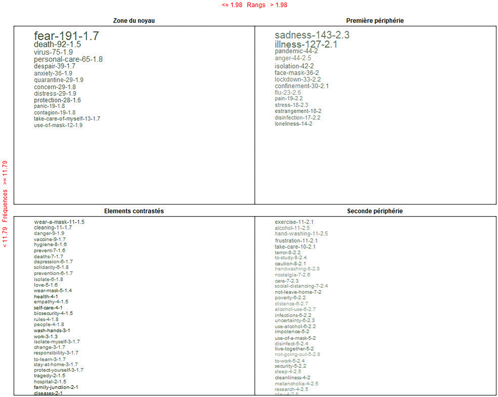 As can be seen in Figure 1, the frequency and the assigned hierarchy are different when it is expressed in its own name and substitutively. If the core is reduced to two words, the results show subtle variations in conceptions. In the first instance, they revolve around the conceptual duo: illness-death; for classmates, fear-illness; and for family, fear-death. In the end, with the integration of similarity, prototypical and factorial analysis, in the three cases, a triplet (core-contrast-periphery) of the alternative conceptions was determined: as core, death; for contrast, danger; and for the periphery, quarantine.