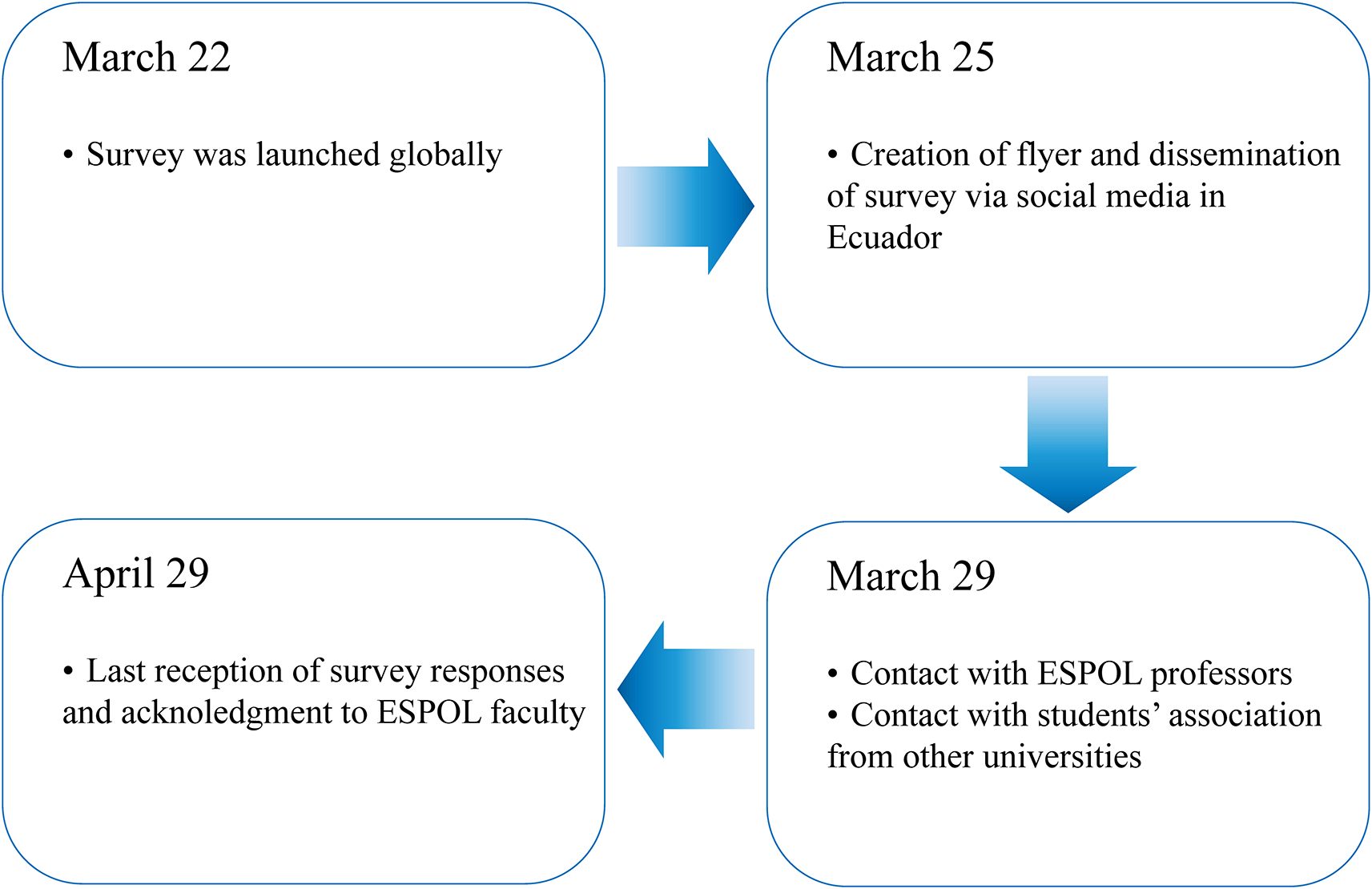 Figure 1 presents a summary of the main dates in the dissemination process. Although the survey was launched globally on March 22, the recruiting process in Ecuador began formally on March 25. The first thing to do was create a flyer containing information regarding the time it would take to complete it, the study’s objectives, the informed consent, and the anonymity of the responses. The flyer was mainly used as an instrument in social media to help respondents understand, with a glance at the flyer, the kind of questions they would be expected to answer and some context for the study.