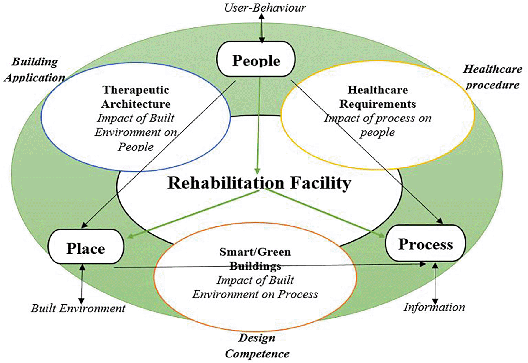 The rehabilitation facility comprises three drivers: people, place, and process. For the therapeutic architect to create a design that is effective for people, they must understand user behaviour. It may require working with data (information) to actualise an efficient process and utilise sustainable built environment strategies to create a healthy place. However, between people (user-behaviour) and the built environment, there is the engagement of building applications through therapeutic architecture, which may affect the built environment’s impact on the people. The flow from the built environment (place) to the process needs design competence for green building technology, and the resultant effect is the impact of the built environment (place) on the process. Ultimately, the process for the people requires the execution of the healthcare procedure that can initiate the process impact on the people through engaging the healthcare requirements. Therefore, the knowledge and manipulation of this therapeutic concept, properties, practice, and components may produce a healing rehabilitation environment required for a smooth and comfortable recovery rate for ADSs in an ADRC.