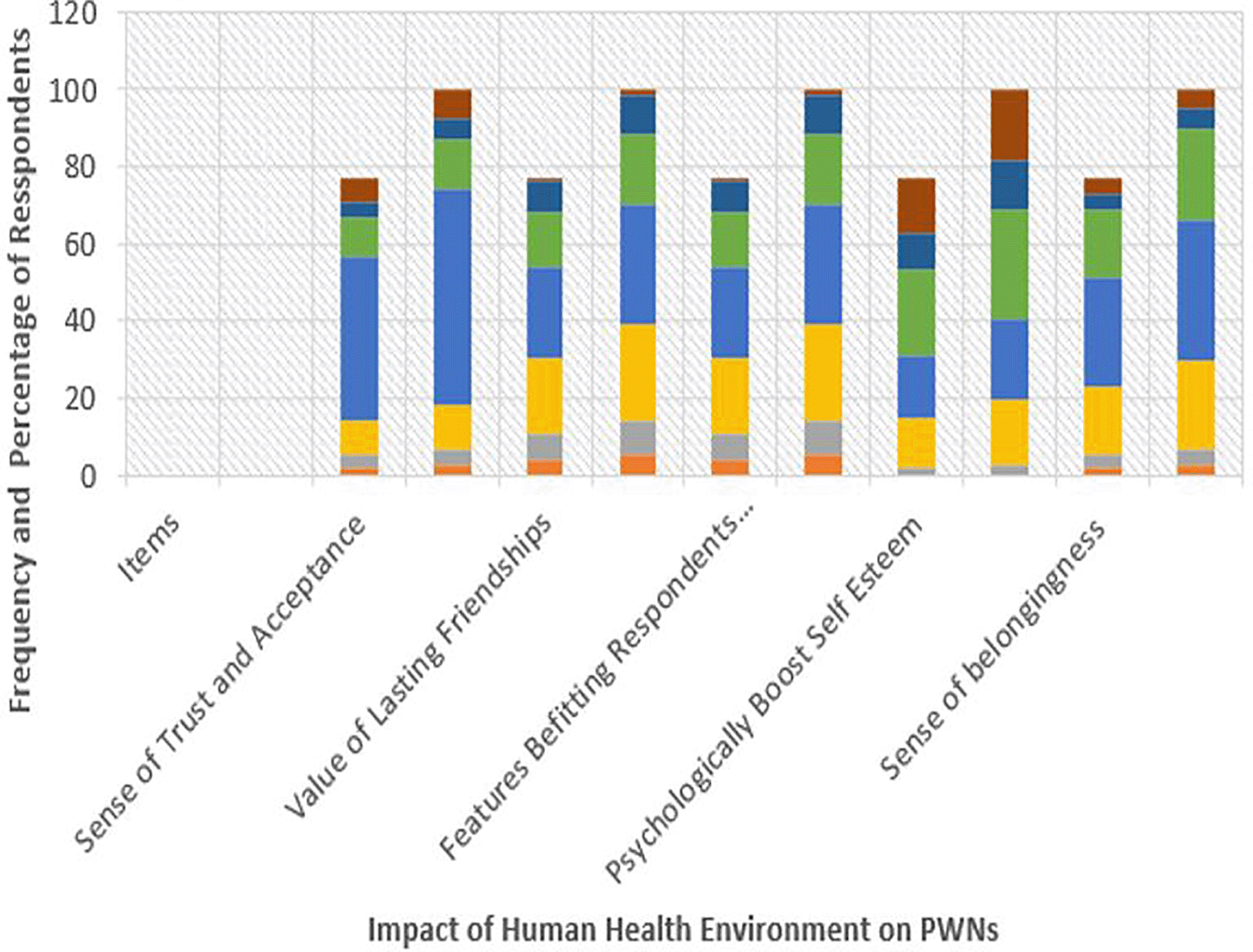 Figure 6 indicates that 2.6% of respondents considered the facility’s sense of trust and acceptance as very poor, 3.9% as poor, 11.7% as fair, 55.8% as average, 13.0% as good, 5.2% as very good, and 7.8% indicated it as excellent. Similarly, 5.2% of respondents described the value of lasting friendships within the facility as very poor, 9.1% as poor, 24.7% as fair, 31.2% as average, 18.2% as good, 10.4% as very good, and 1.3% as excellent. The results indicate that rehabilitation facilities should provide more spaces and activities that foster social interaction and improve the value of lasting friendships as a TAC for patients’ healing process. The result on elements (available amenity) that meets patient’ status/needs reveal that 5.2% considered it as very poor, 9.1% as poor, 24.7% as fair, 31.2% as average, 18.2% as good, 10.4% as very good, and 1.3% as excellent. Likewise, 2.6% of respondents indicated that the facility poorly boosted their self-esteem psychologically. In contrast, 16.9% stated that its ability to boost their self-esteem was fair, 20.8% as average, 28.6% as good, 13.0% as very good, and 18.2% as excellent. For a sense of belongingness, 2.6% of respondents considered it very poor, 3.9% as poor, 23.4% as fair, 36.4% as average, 23.4% as good, 5.2% as very good, and 5.2% as excellent.