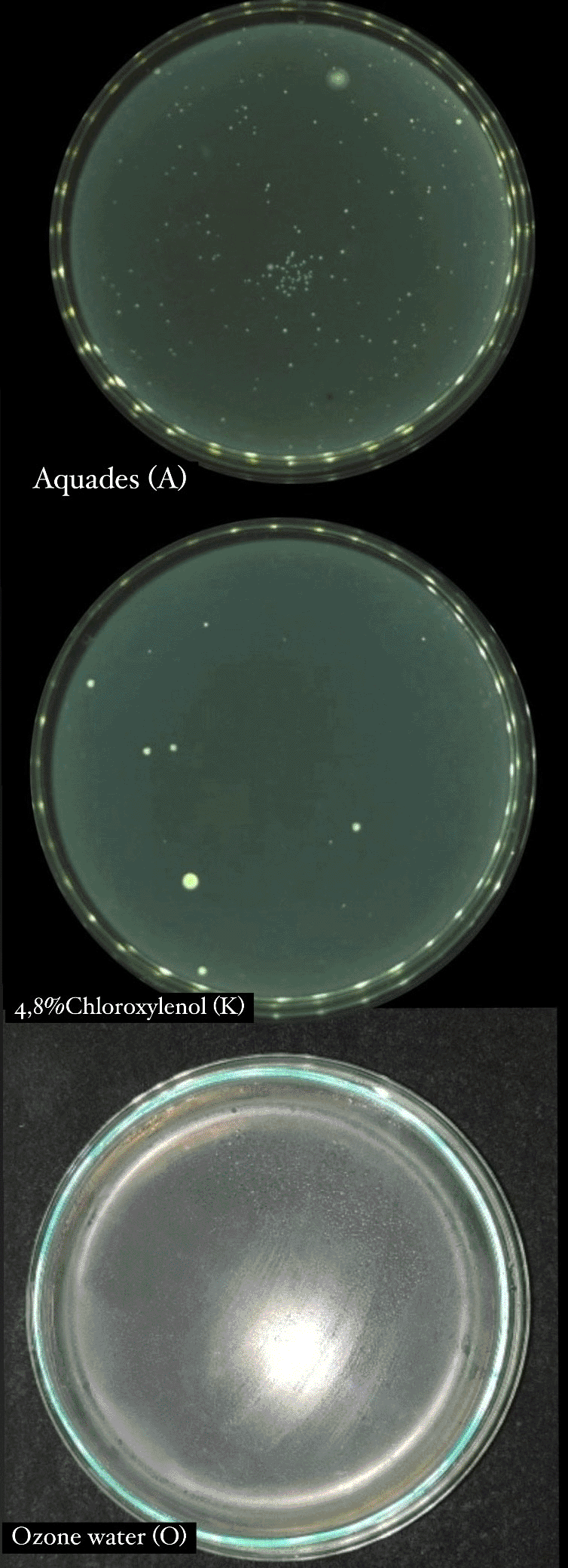 Ozone water, Chloroxylenol, Bacterial Colony