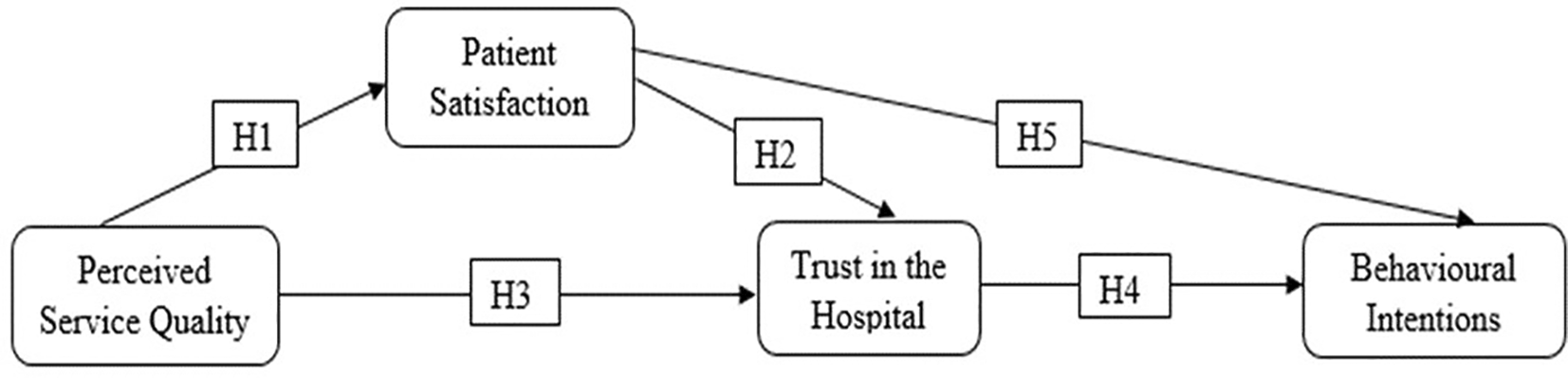 The proposed conceptual framework (Figure 1) suggests that PSQ influences BI through PS and trust in the hospital.