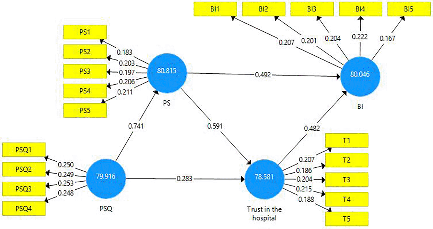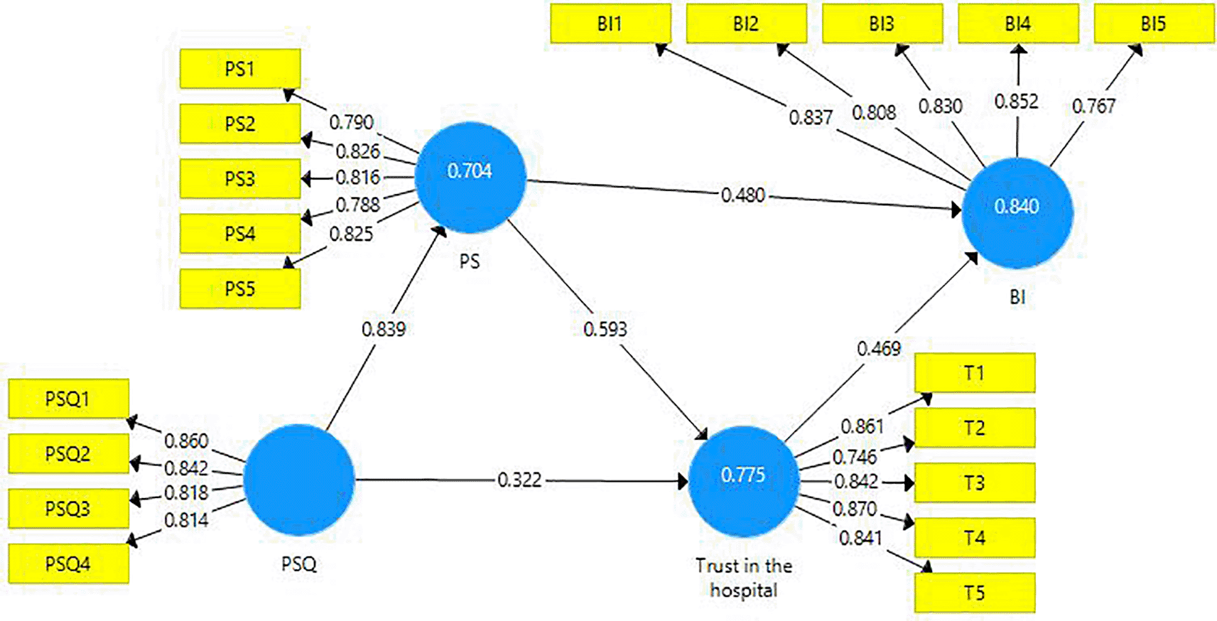 In this study, a partial mediation relationship is observed between PSQ and trust in the hospital. Also, there is a partial mediating relationship between PS and BI. This study consists of a conceptual framework; the hypotheses were proposed based on the literature review explaining the association between the constructs. The proposed model is empirically tested, and validity and reliability of the constructs were estimated. Hypotheses testing and mediation analysis were done. IPMA was done to estimate the performance of endogenous variables through the exogenous variables.